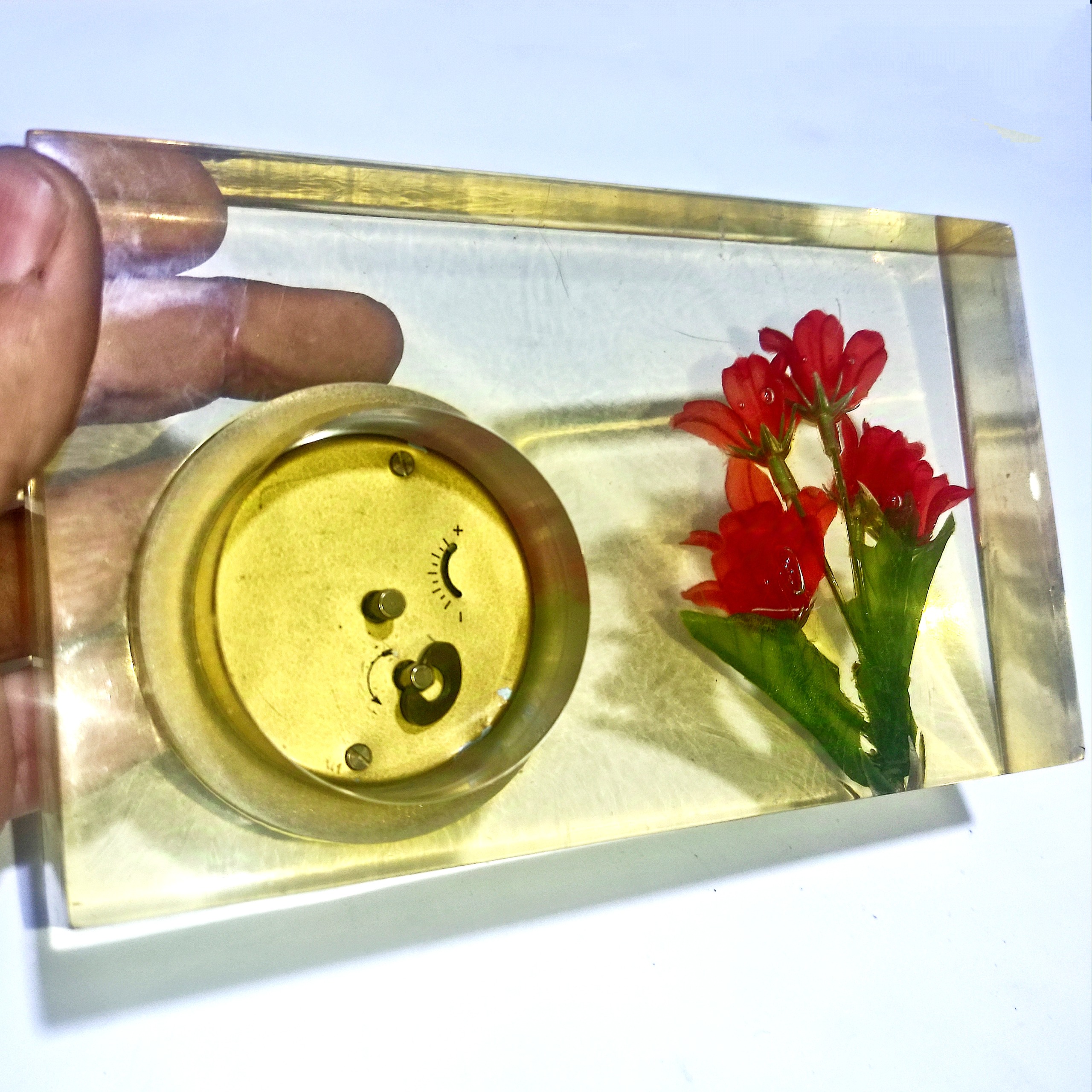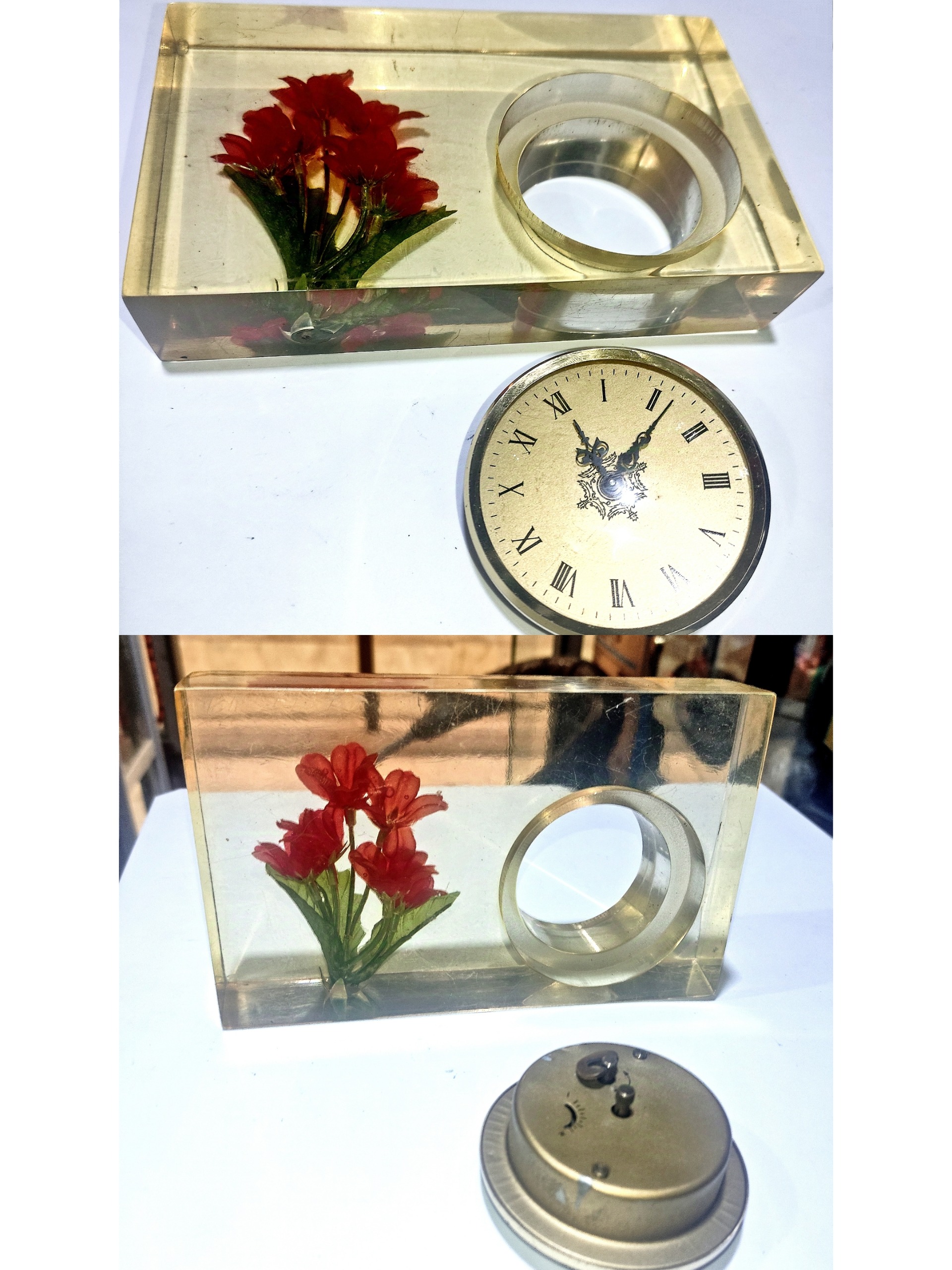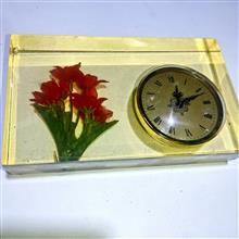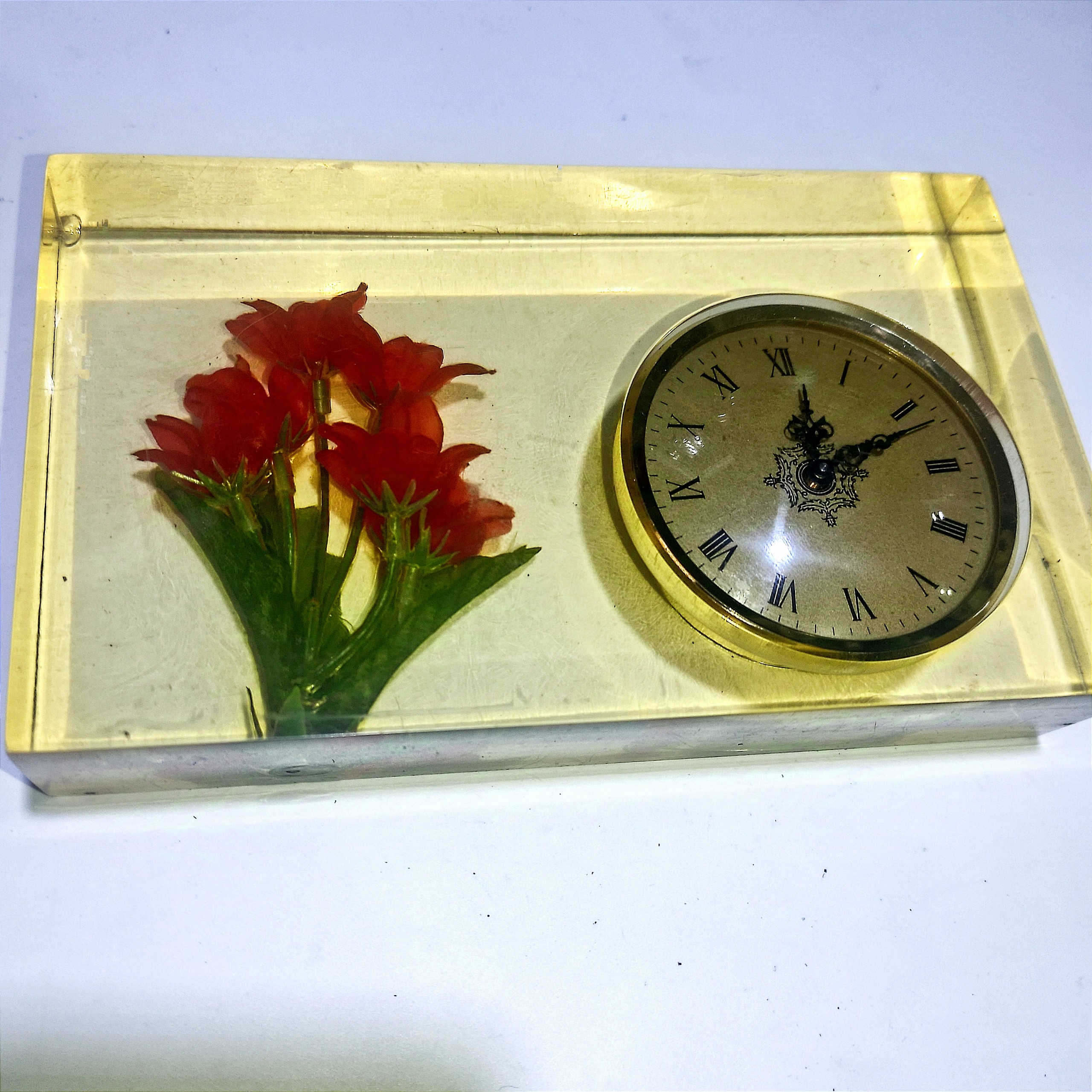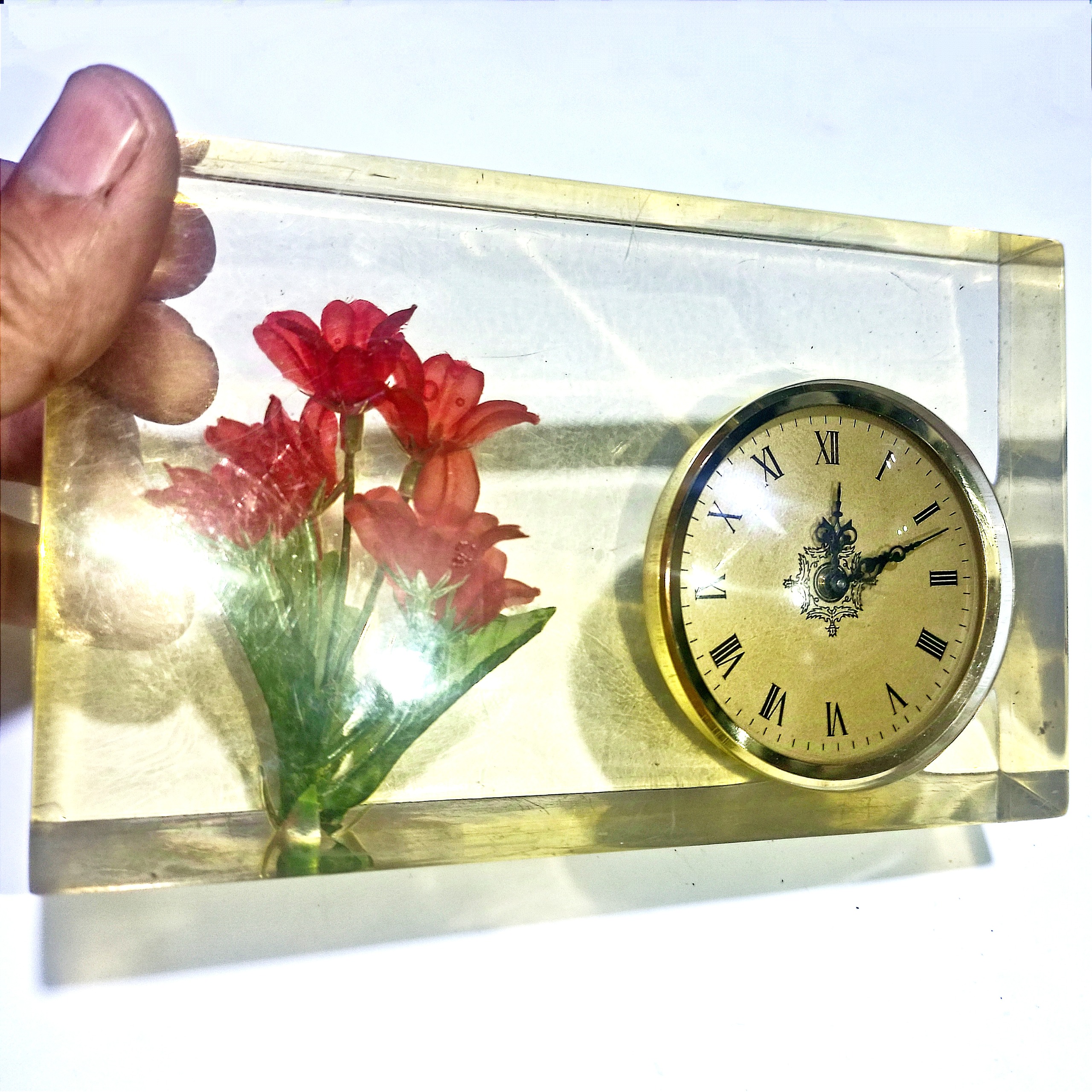 ساعت رومیزی تمام رزین از جمله دستسازه های بسیار شیک و مدرن امروزی است- که البته این مدل کمی قدیمی تر است- و میتواند جایگزین ساعت های رومیزی و دیگر شما شود و زیبایی منزل شما را دوچندان کند.این ساعت دارای گل های مینیاتوری مصنوعی است که درقسمت چپ ساعت قرار گرفته اند. موتور ساعت مدل توکار طلایی رنگ به قطر 7 سانتمتر است که قابلیت تعویض دارد.