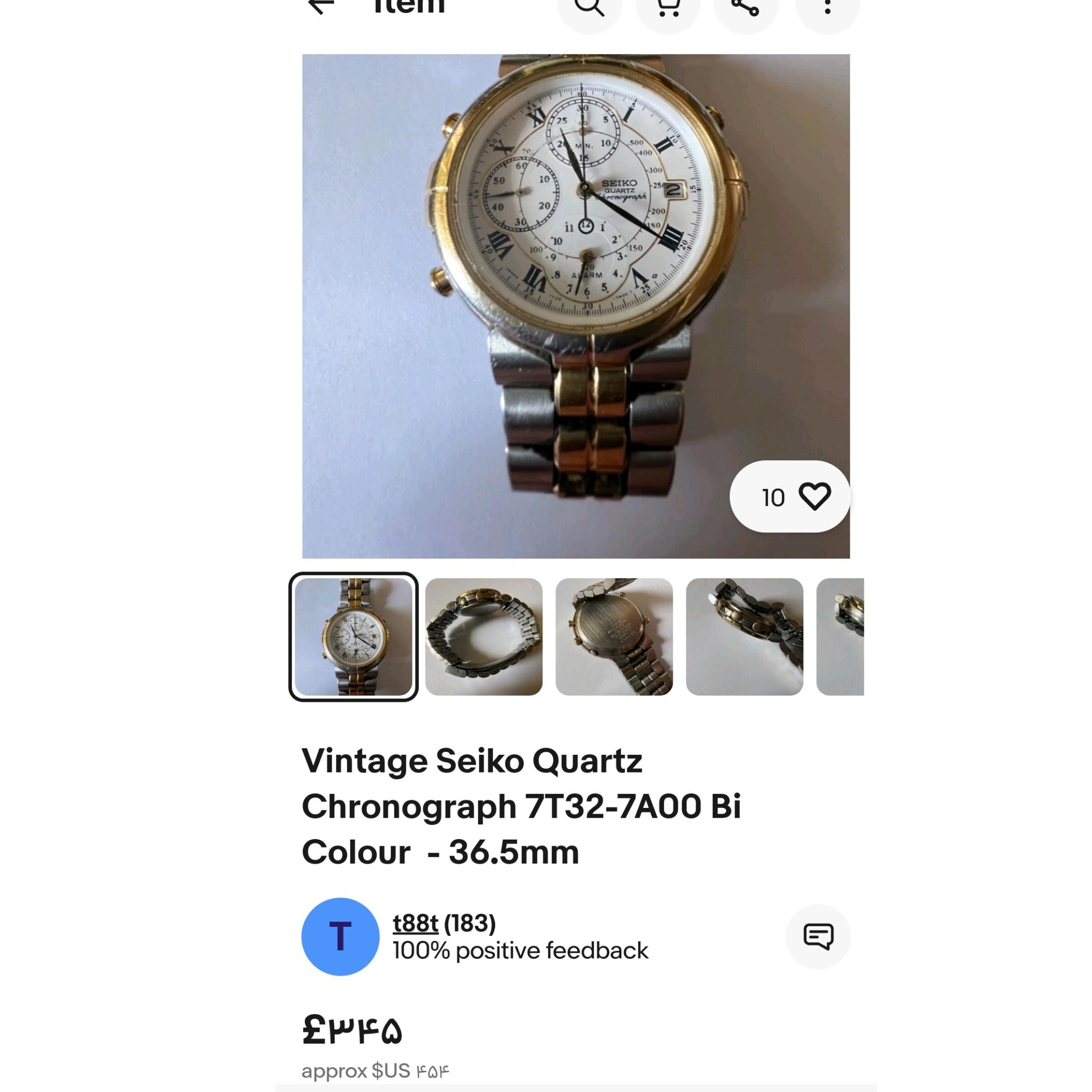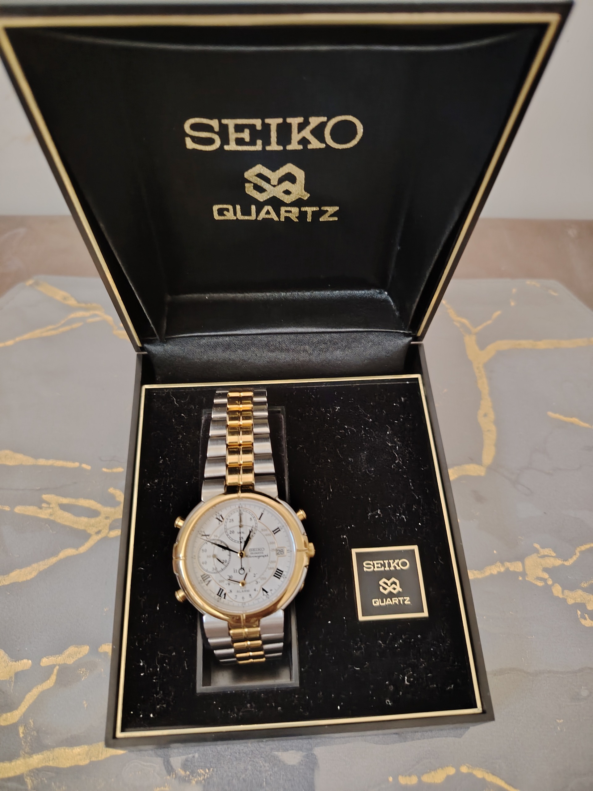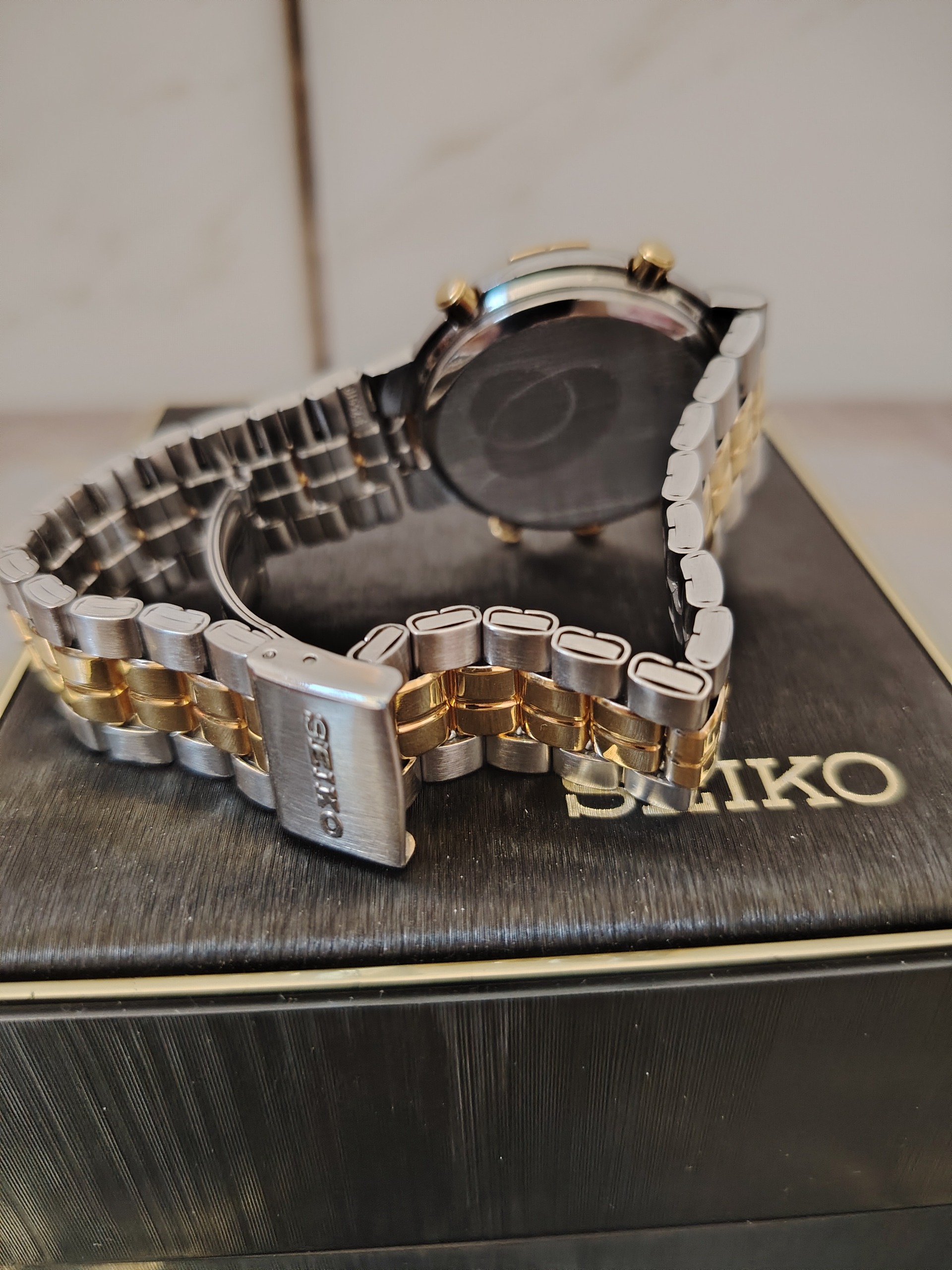 ساعت مچی مردانه برند معروف سیکو یک برند ژاپنی محبوب و مشهور در جهان است معروف به سیکو کرنوگراف کالیبر 7t32 که در سال 1988 میلادی توسط شرکت سیکو ژاپن معرفی شد و سال 2005 از تولید متوقت شد این ساعتی که آگهی کردم تولید 1995 میلادی می باشد 30 سال قدمت دارد که در کلکسیون آکبند نگهداری شده قیمت جهانیش هم گذاشتم ببینید در سایت ای بی انگلیس 345 پوند با وضعیت کار کرده قیمت خورده