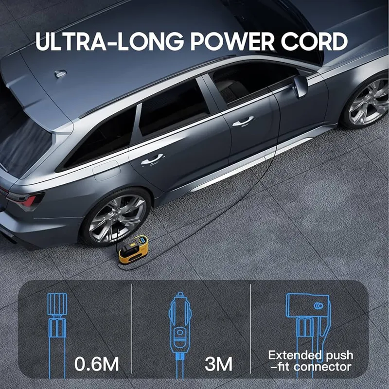 کابل برق بسیار بلند و چراغ LED اضطراری: پمپ باد دارای کابل برق 3 متری است که باد کردن چرخهای جلو و عقب را آسان میکند و در زمان و تلاش صرفهجویی میکند! چراغ LED داخلی برای مواقع اضطراری و کار در محیطهای تاریک عالی است.
