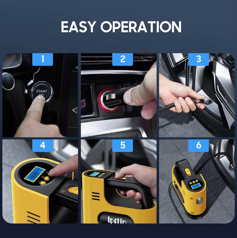 به پریز برق 12 ولت خودرو وصل کنید، لاستیک را وصل کنید و دکمههای «+» و «-» را برای تنظیم فشار مورد نیاز فشار دهید.