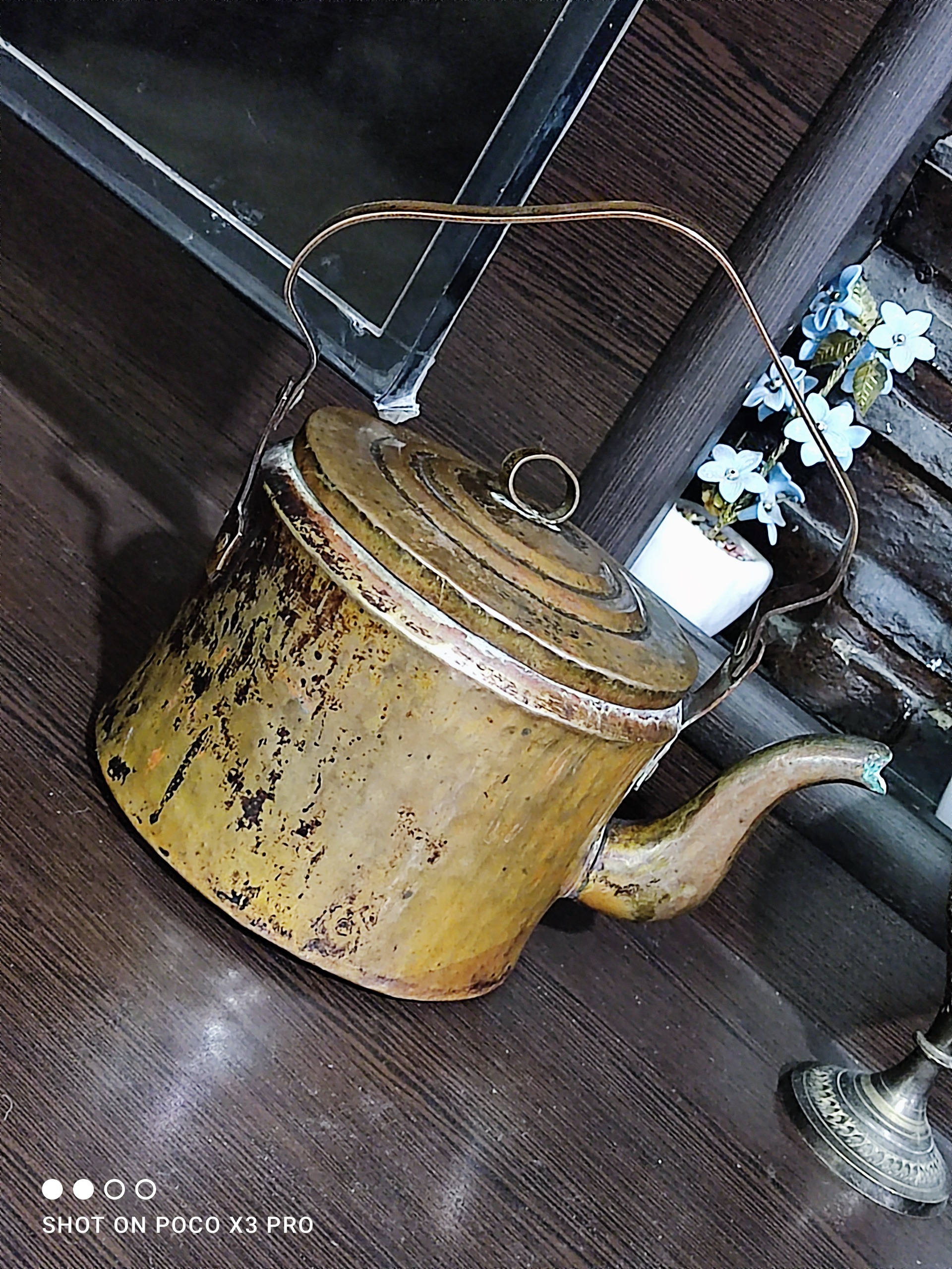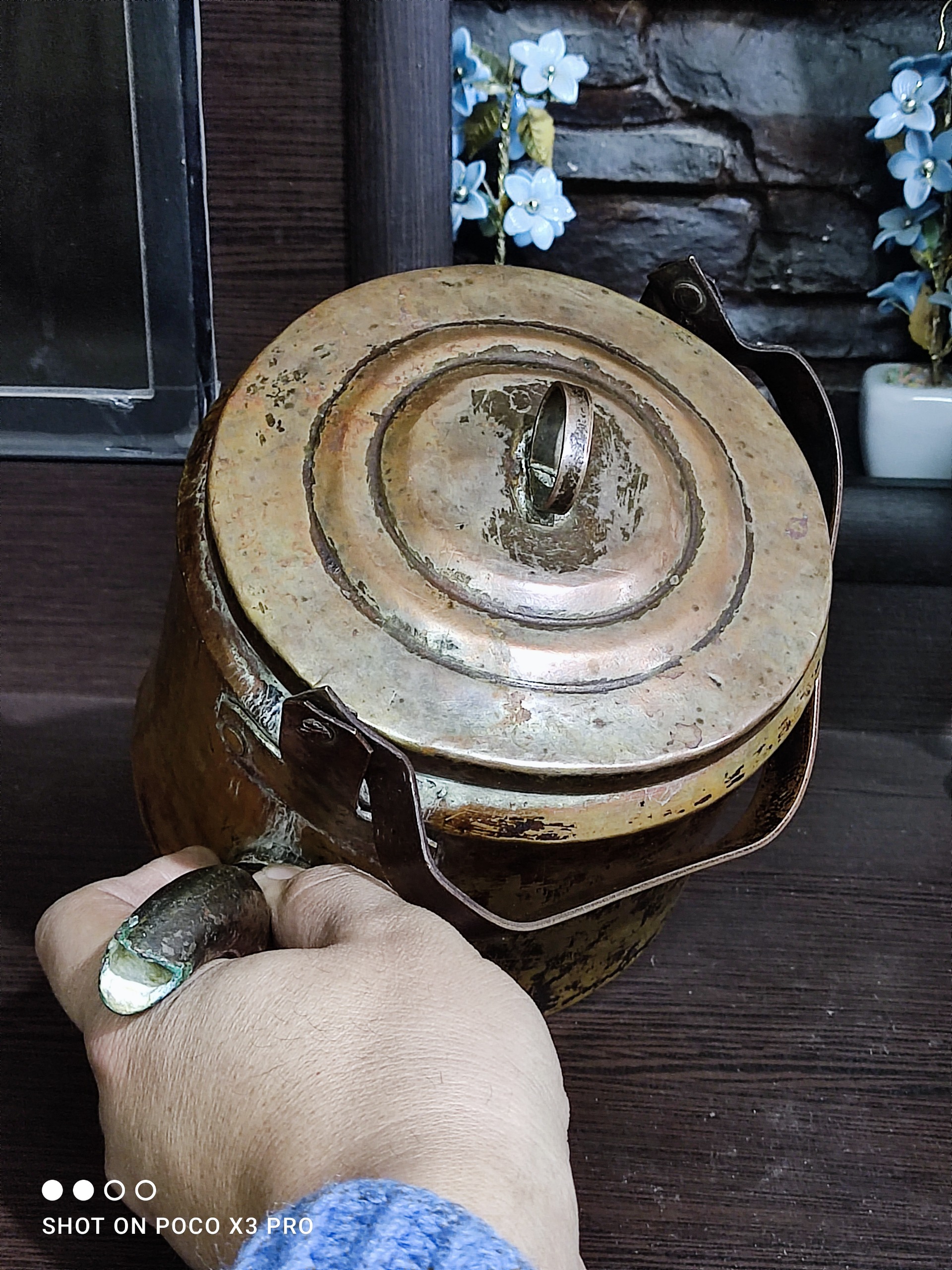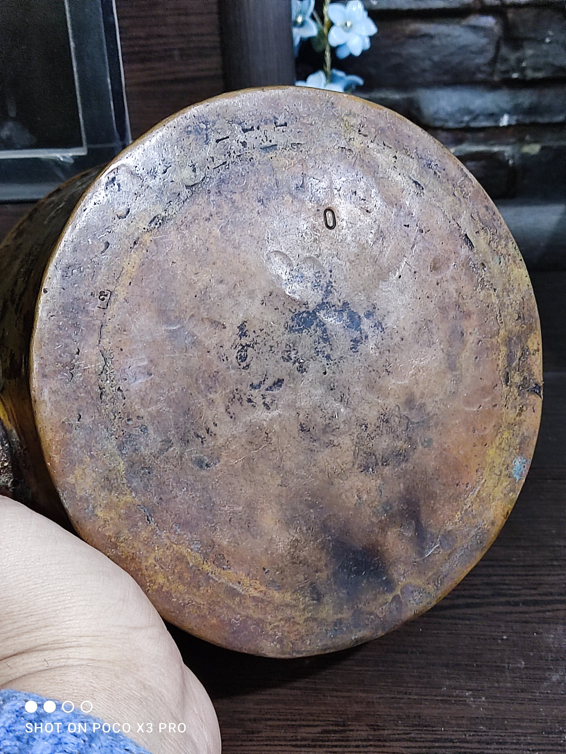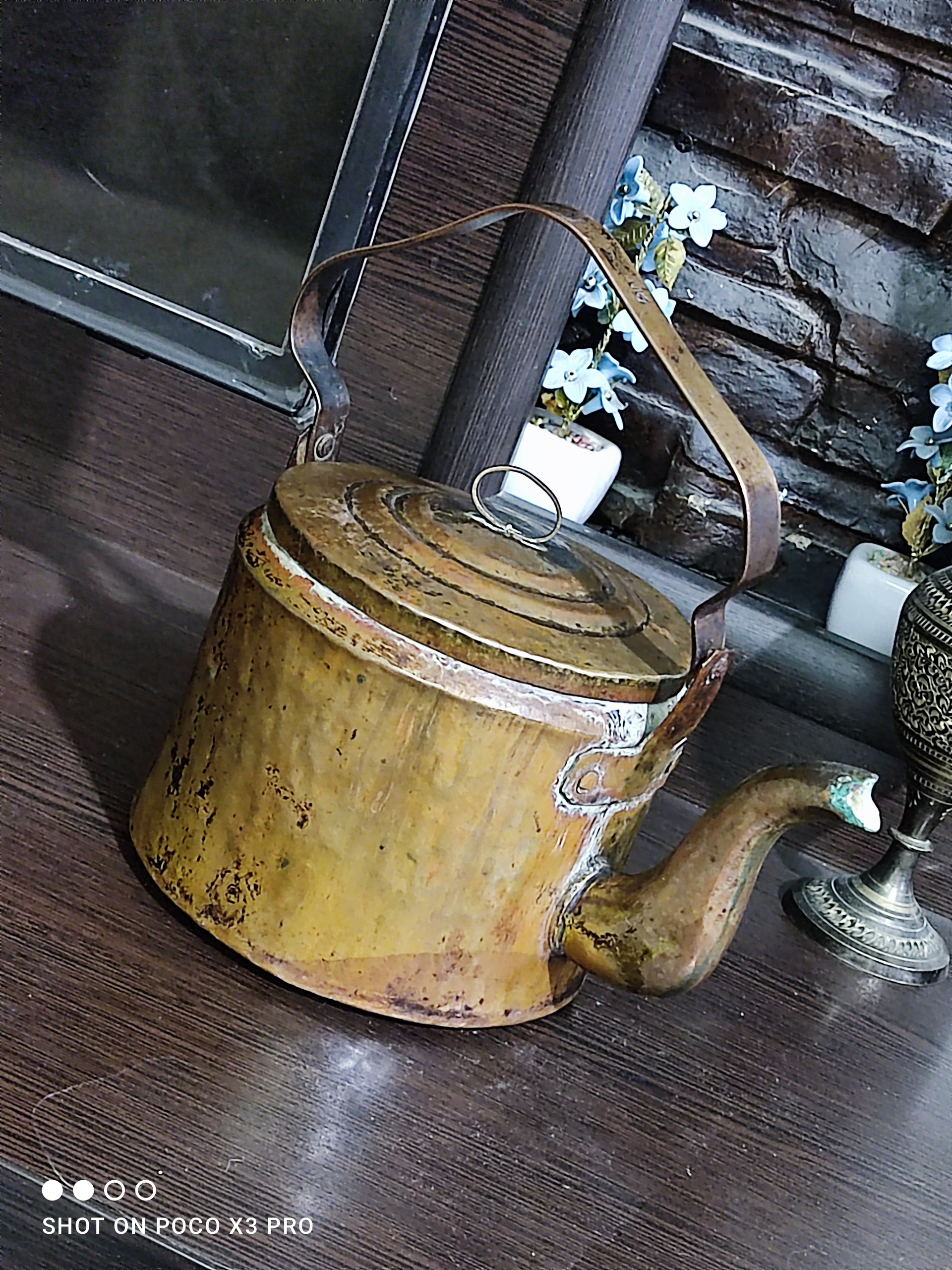 یک عدد کتری مسی کهنه و بسیار قدیمی دستساز و کلکسبونی مطابق تصاویر حدود یک کیلو وزنشه سایزش تقریبا یک و نیم لیتریه بسیار محکم و جوندار داخل کتری بخاطر قدمت خیلی زیادش گچک زده بود کمن دارم تمیزش میکنم قدمت این کتری مسی مربوط به دوره قاجاره بدون شک قسمت پایین و بالای کتری کلمه صفر به انگلیسی حک شده دوتا احتمال وجود داره یا کتری خارجیه دستش عوض شده چون روی دستش هم اسم سازندش حک شده هم زنجان نوشته شده احتمال دوم اینه که دستش فابریک خودشه و کتری کار زنجانه سالم و تمیز و بکر