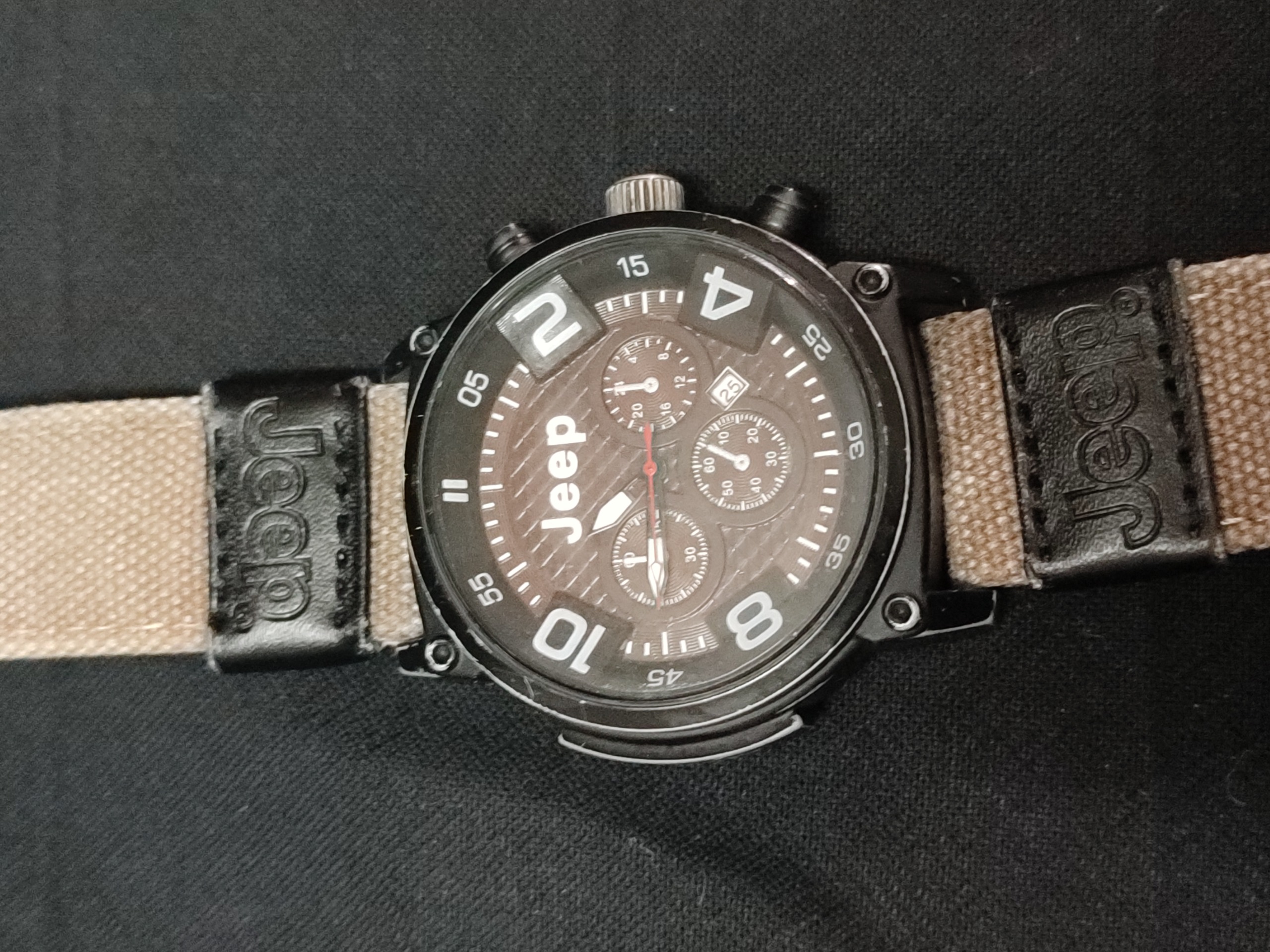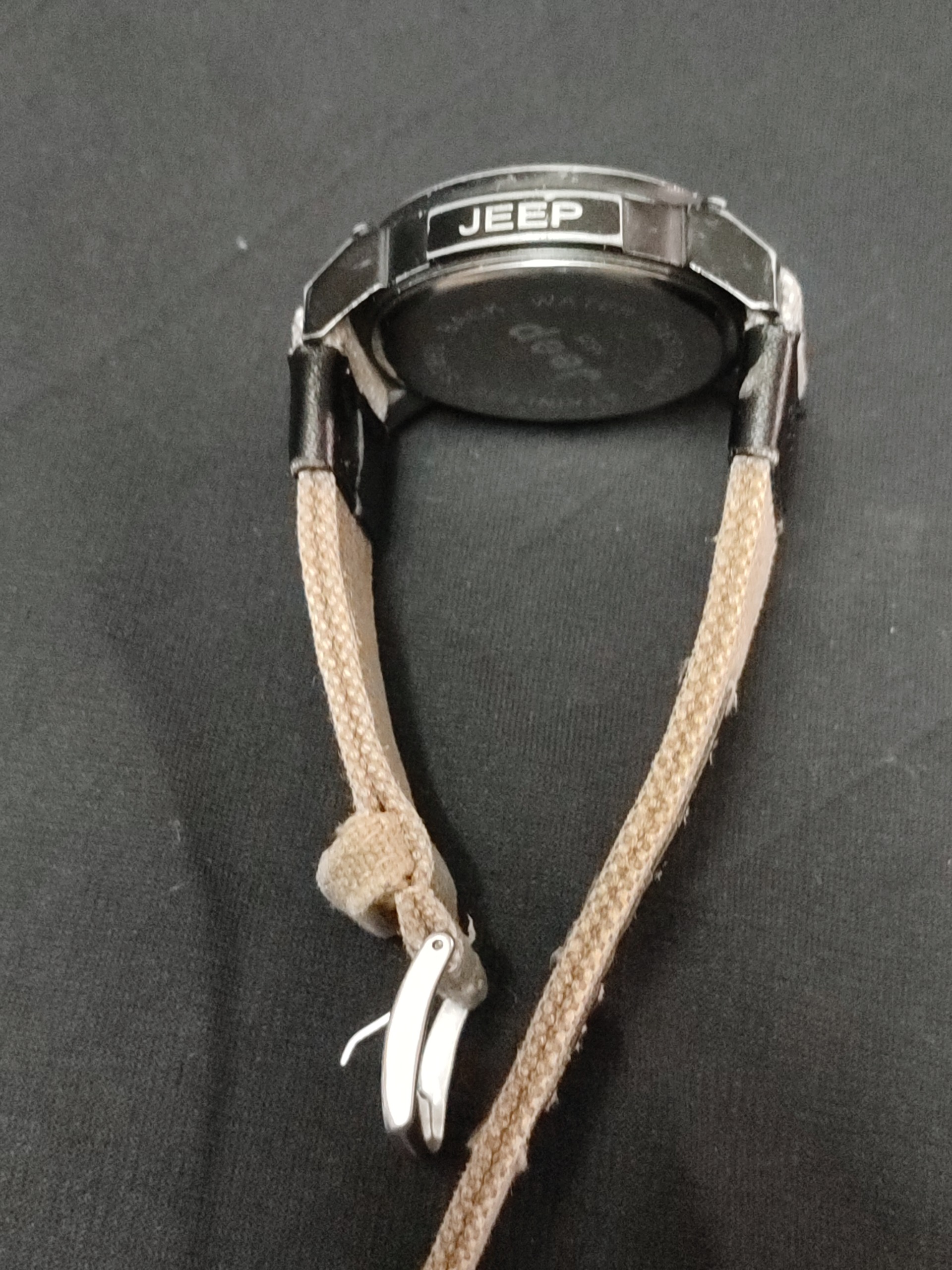 آرم jeep روی صفحه ، پشت ساعت ، روی هر 2 بند و روی سگک و کنار قاب حک شده