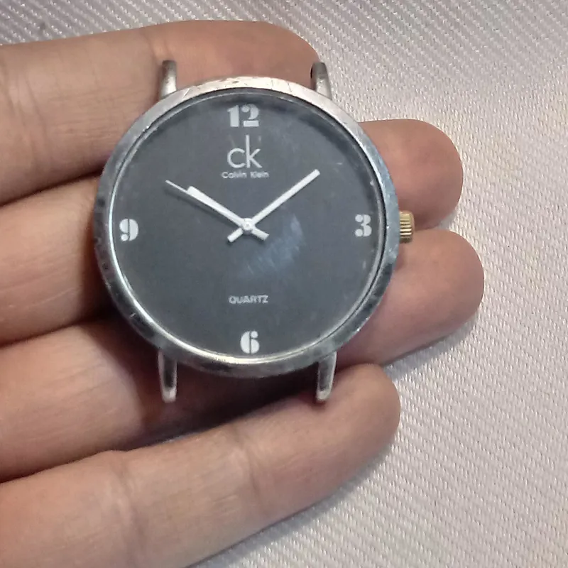 ساعت کلوین کلاین طبق تصویر با صفحه گرد بزرگ صحیح و سالم فقط باتریش تموم شده و باید باتری انداخت.دقیق و سالم بدون بند ....ظاهر شیک و باطن خوب .صفحه نسبتا بزرگ داره .مردانه.اسپرت.قیمت ثبت شده برای ساعت بدون بند و باتری هست .کاملا طبق تصویر ارسال میشود .به شرط یه عمر  کارکرد خوب