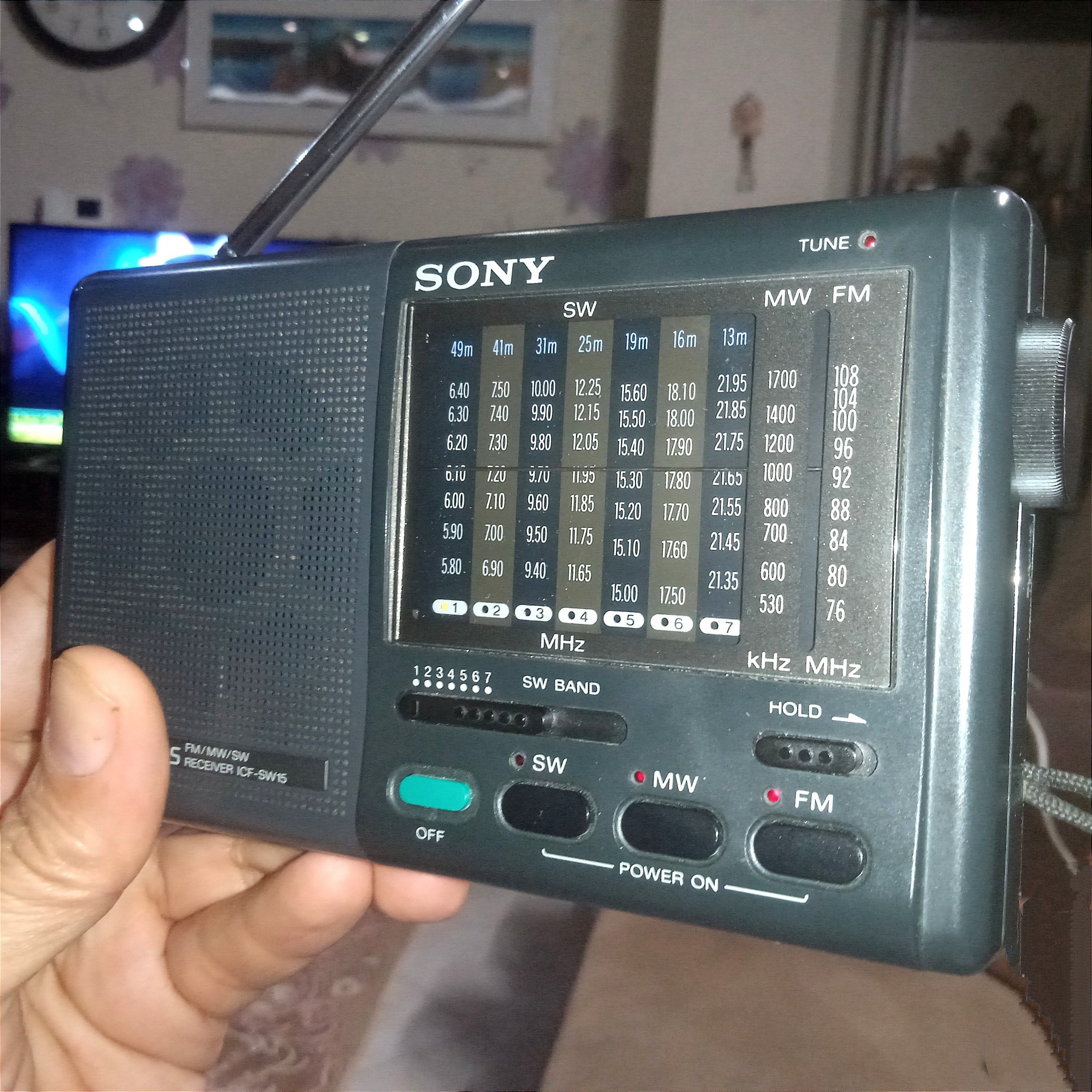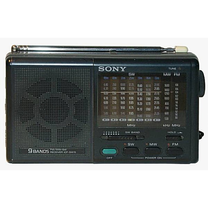 رادیو 9 موج ICF-SW15 هفت باند موج کوتاه و FM و MW را پوشش می دهد. این رادیو پرتابل دارای صفحه آنالوگ می باشد. پوشش موج کوتاه: 5775-6425، 6875-7525، 9375-10025، 11615-12265، 15000-15600، 17500-18150، 21325-21975 کیلوهرتز.