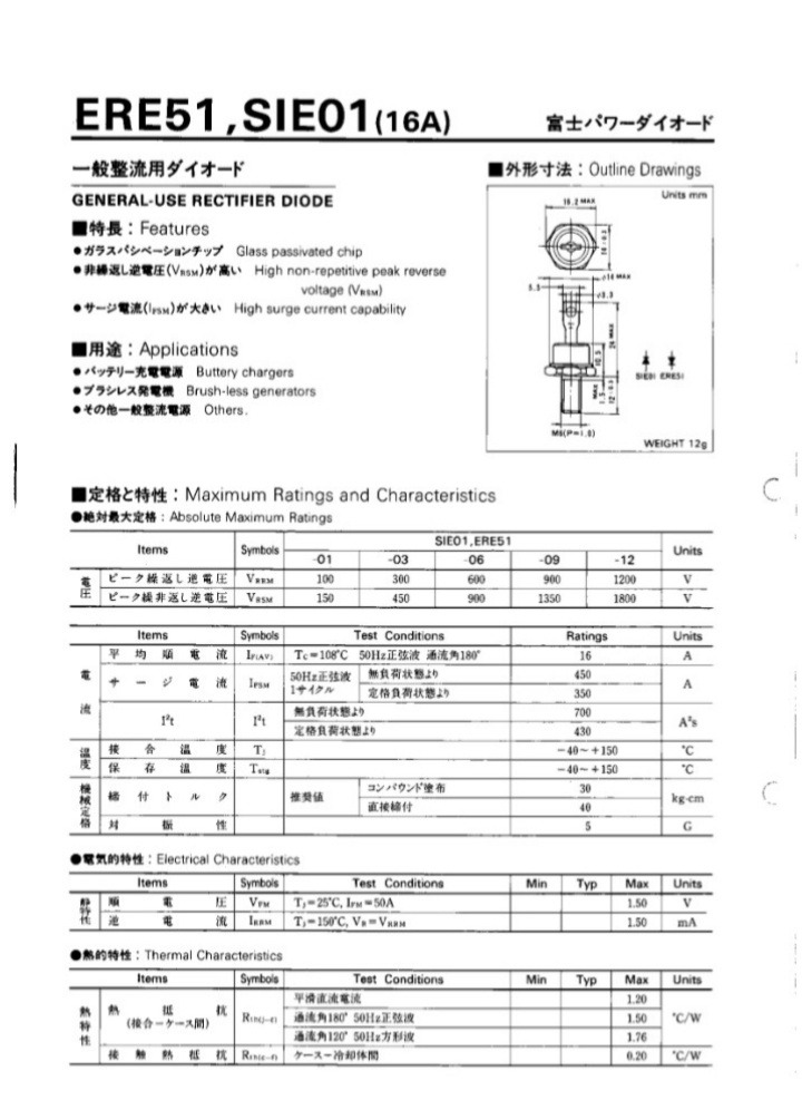 دیود 16A/1200 برند ERE51-12 فوجی ژاپن بدنه منفی