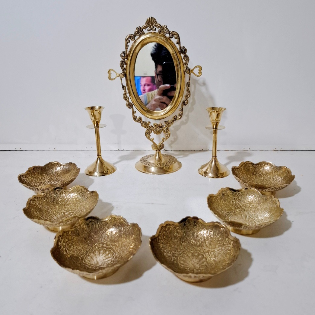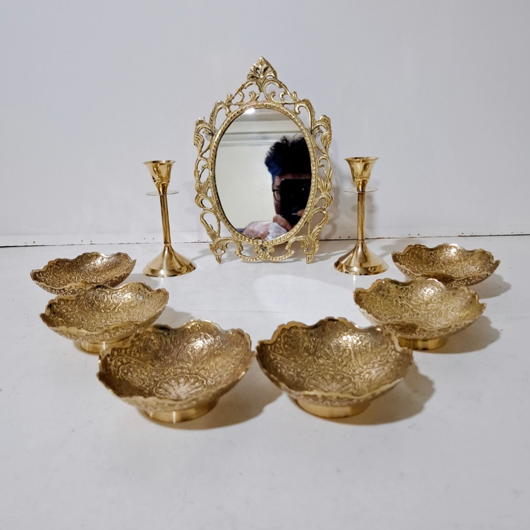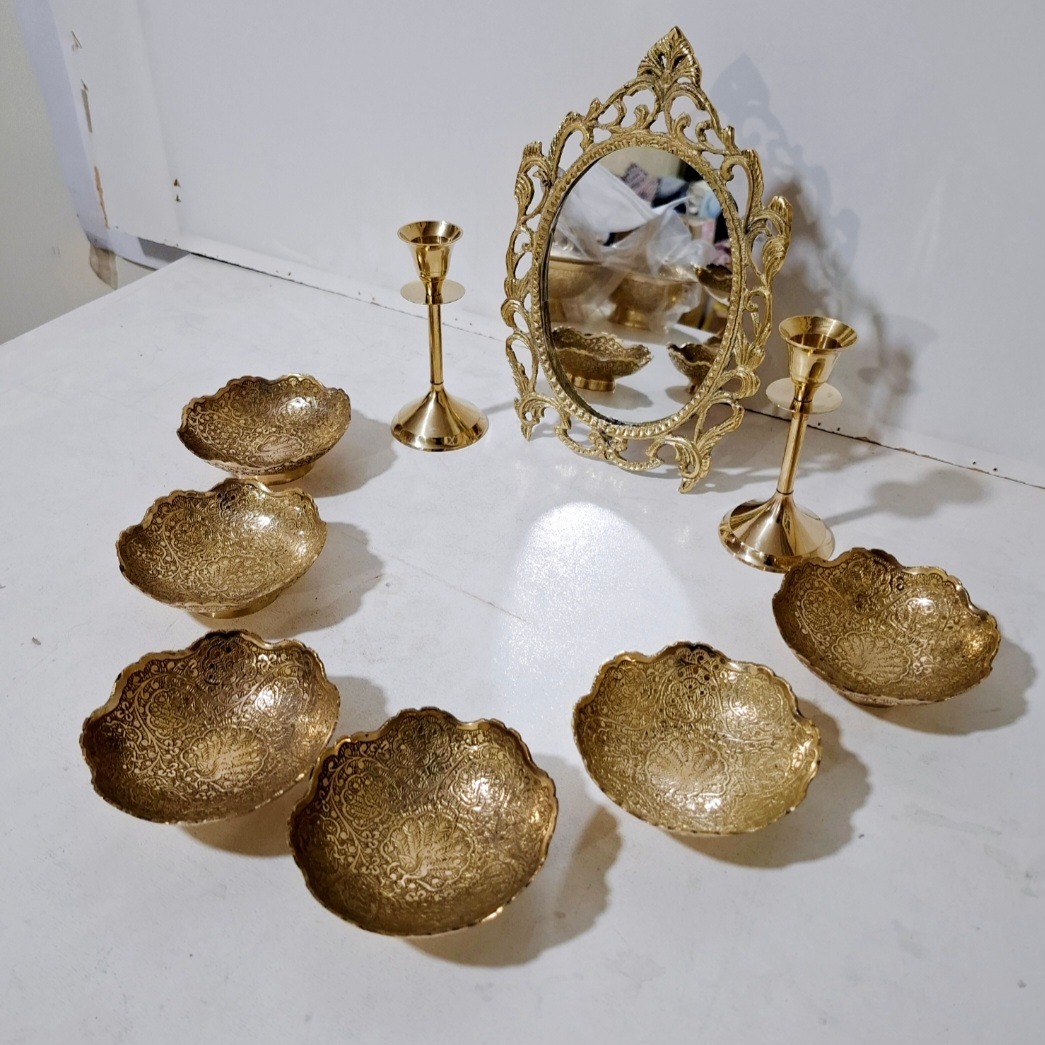هفت سین برنجی هندی مدل نیم پایه با 6عدد پیاله دو رو قلم دست با قطر 10 سانتمتر و آینه با ارفاع 26 سانتمتر و دو عدد شعمدان با سطح کیفیتی درجه یک مناسب استفاده دائم و قابل شستشو و بدون تغییر رنگ با ضمانت 5 ساله