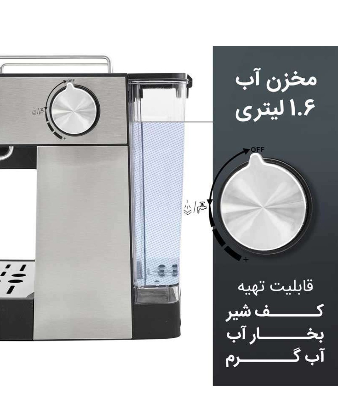دارای استیمر بخار جهت تهیه کف شیر کاپوچینو، لاته، موکا و