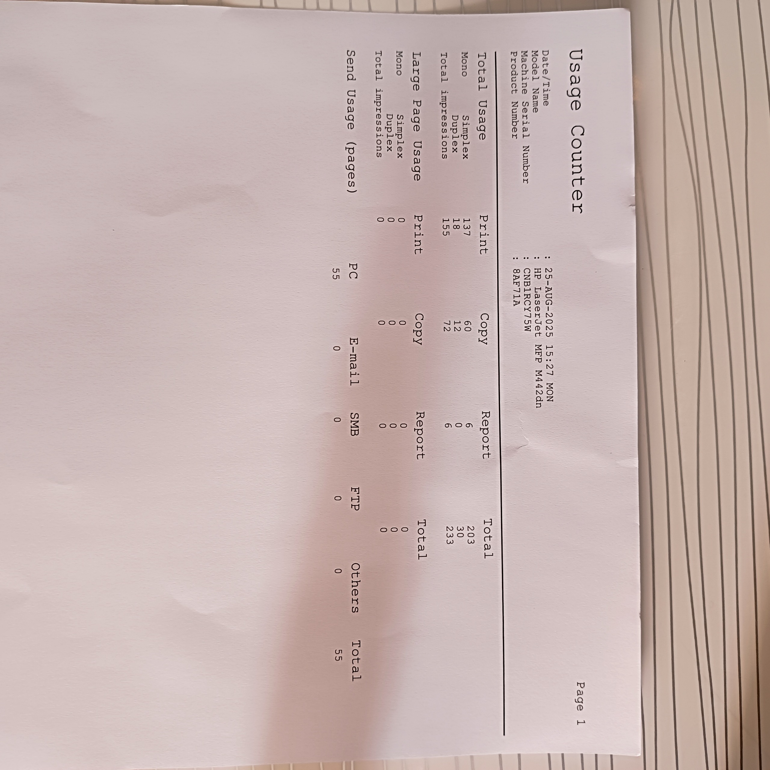 طبق پرینت گزارش کارکرد دستگاه که در تصاویر قرار داده شده ، کلا تعداد 233 برگ با دستگاه کپی یا پرینت گرفته شده که در حد تست میباشد و طبق تصویر گرفته شده از مونیتور دستگاه ،کارتریج اورجینال کاملا فول میباشد.