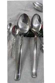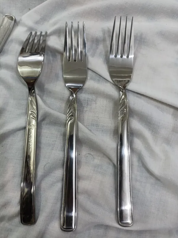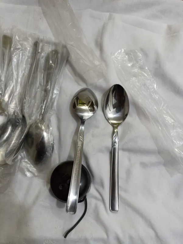 قاشق و چنگال غذا خوری ساخت ژاپن..آکبند..مارک حسن بن علی،، اصلی و بسیار سنگین.. آکبند این مدل قاشق و چنگال ها بسیار کمیابه ا..همین مدل قاشق چنگال ها داخل ایسام هست و میگن اصلیه ولی وزن قاشق هایی که گذاشتم وزن 6عددش  تقریبا200گرم بیشتره..قیمت 12عددقاشق و12چنگال غذا خوری ثبت شده...این قاشق ها جعبه نداردآکبنده و اصلا استفاده نشده..