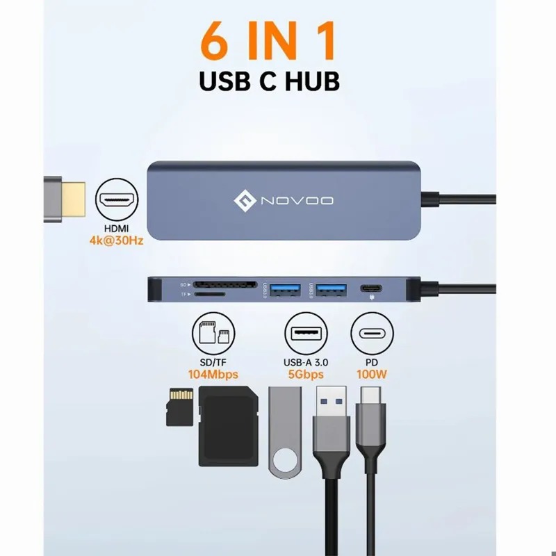 آداپتور 6 پورت : هاب NOVOO یک پورت Type-C را در لپ تاپ شما به 6 پورت با عملکردهای مختلف تبدیل می کند : HDMI 4K x1، USB 3.0 x 2، Type-C 100W PD پورت ، اسلات کارت SD/ TF آداتور مک بوک USB C Hub برای کارهای اداری ، جلسات ، دفاتر خانگی کلاس ، درس ، بازی ، تماشای فیلم یا نیازهای روزانه شما عالی است . این هاب USB C می تواند به طور خودکار کارایی شما را افزایش دهد ، فقط کافی است و مراجعه کنید !