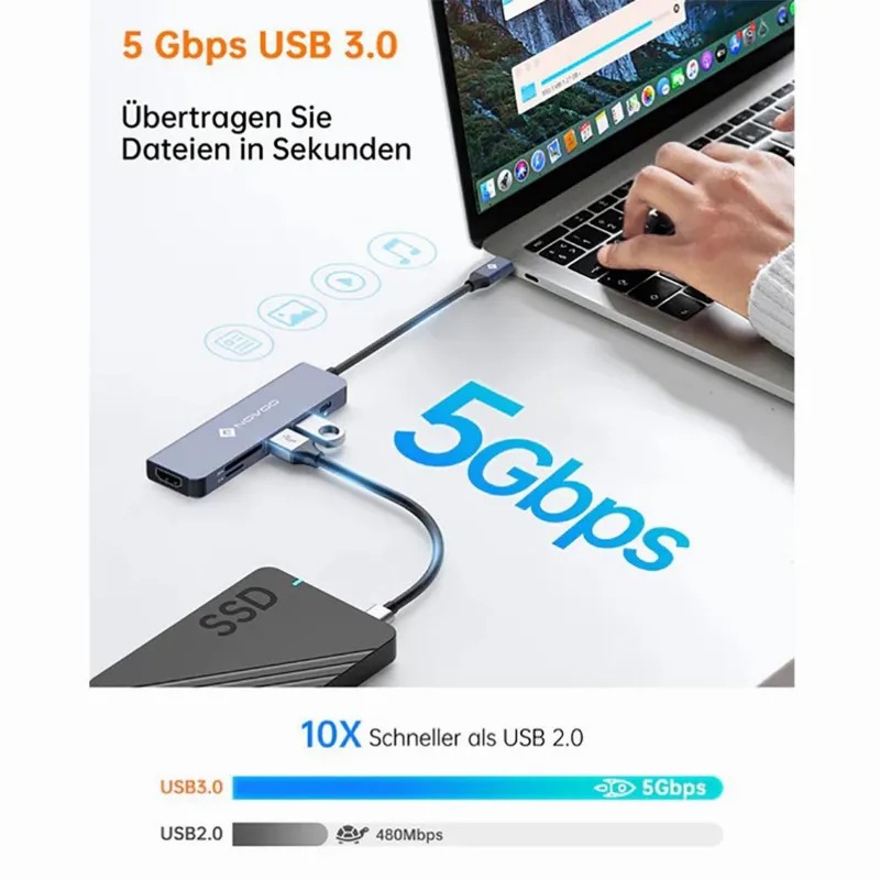 هاب NOVOO 6 در 1 هاب USB C هاب آداپتور USBC 2x USB 3.0 سرعت انتقال داده تا 5 گیگابیت در ثانیه را دارا است . از انتقال فوق سریع انواع داده ها از دستگاه های USB به لپ تاپ های Type-C با امکانات کامل پشتیبانی می کند . می تواند همزمان 2 دستگاه USB-A مانند هارد دیسک، صفحه کلید ، ماوس،  چاپگر ، پخش کننده MP3 و غیره را به هم متصل کنید . این هاب با صرفه جوئی در اتصال و قطع مکرر دستگاه باعث صرفه جوئی در زمان و افزایش کارایی می شود .