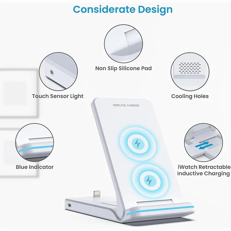 طراحی زاویه قابل تنظیم : موقعیت شارژ تلفن همراه را می توان در زاویه 45 درجه (توصیه شده برای تماس های ویدیویی) و 30 درجه (توصیه شده برای تماشای فیلم) تنظیم کرد . موقعیت شارژ ساعت می تواند آزادانه کشیده شود ، که برای ذخیره سازی و دسکتاپ مرتب راحت است .