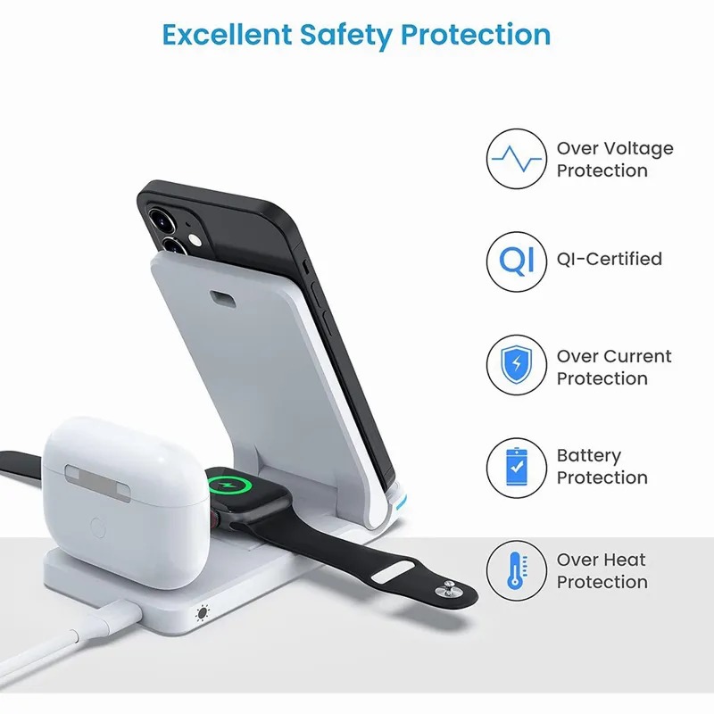 شارژر بیسیم 3 در 1 : ایستگاه شارژ بیسیم Seacosmo میتواند 3 دستگاه را همزمان شارژ کند : تلفن همراه، سری اپل واچ، ایرپاد. شارژر بی سیم با : iWatch 1/2/3/4/5/6/SE، Airpods 1/2/Pro، iPhone /13/14/15/16/12/12 Pro/11/11 Pro/SE 2020/X/XS/XR/XS Max/8/8 Plus، Samsung Galaxy S21/S10 و دستگاه های دیگر قابل سازگاری است .