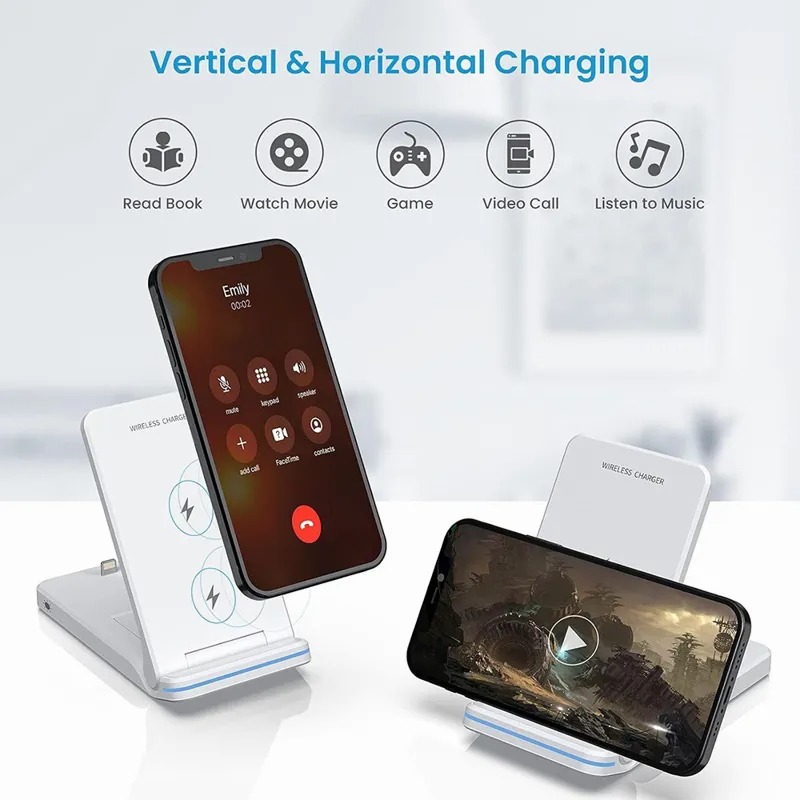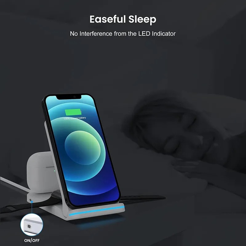 حالت NightstandCable Storage : نشانگر شارژ همچنان چشمک می زند تا خرابی شارژ را نشان دهد . حالت شب می تواند آزادانه نشانگر آبی را خاموش کند ، نگران اختلال خواب خود نباشید. حالت شارژ 3 در 1 پایه شارژ می تواند به طور موثری تجهیزات شارژ را کاهش دهد ، در فضا صرفه جویی کند ، از شر کابل های دست و پا گیر خلاص شود و یک دسکتاپ و اتاق تمیز و مرتب برای شما فراهم کند .