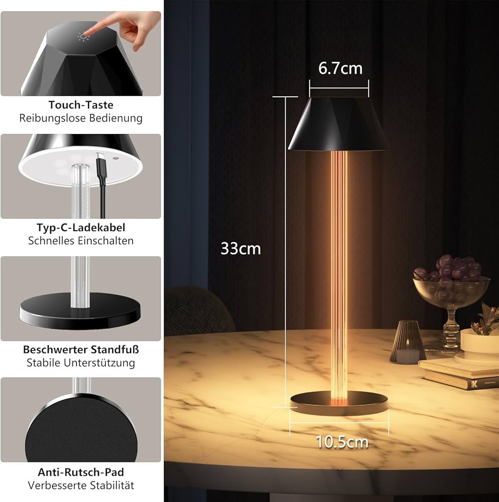 چندمنظوره و زیبا: زیبایی منحصر به فرد و مدرن چراغ رومیزی باتریدار، هر فضایی را از اتاق خواب و دفتر گرفته تا فضاهای بیرونی مانند تراس یا باغ، زیباتر میکند. طراحی تطبیقپذیر، جمع و جور و شیک آن را برای استفاده کاربردی و تزئینی ایدهآل میکند و به طور یکپارچه در محیطهای مختلف مسکونی، اداری یا رستورانی جای میگیرد.
