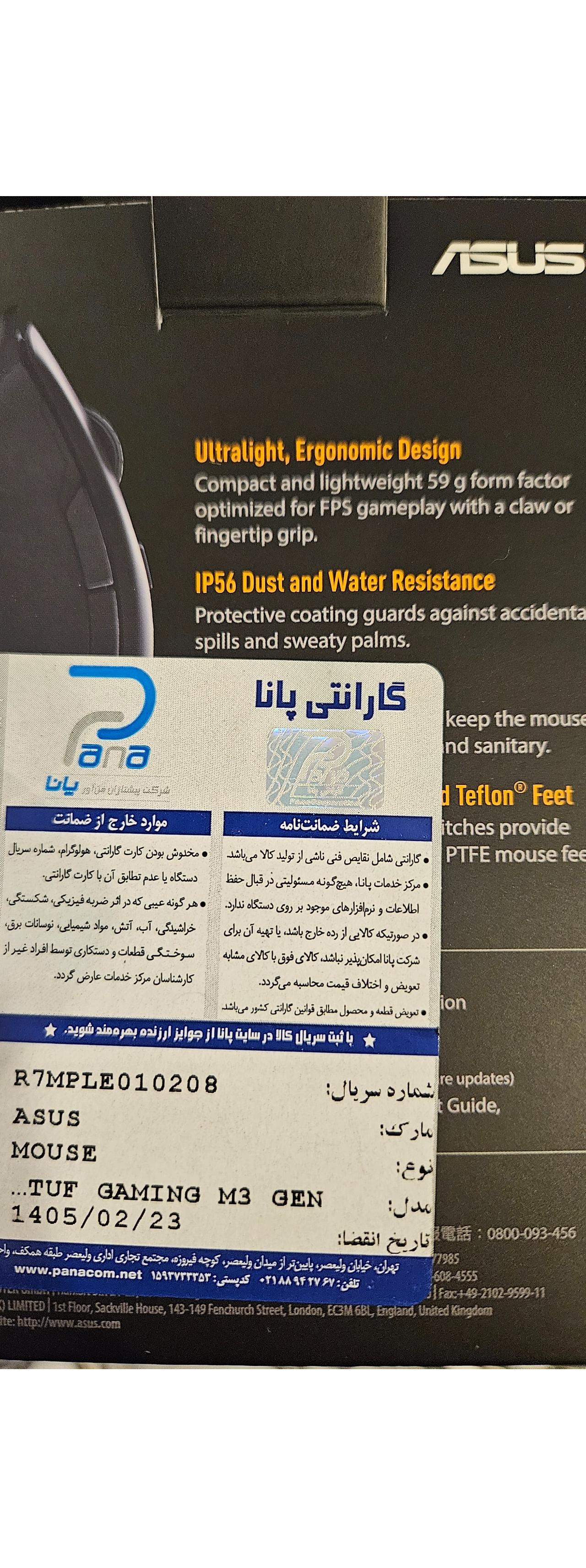 فروش یک عدد موس گیمینگ ایسوس تاف گیمینگ M3 نسل 2 دارای 6 کلید و دقت 8000DPI و وزن 60 گرم