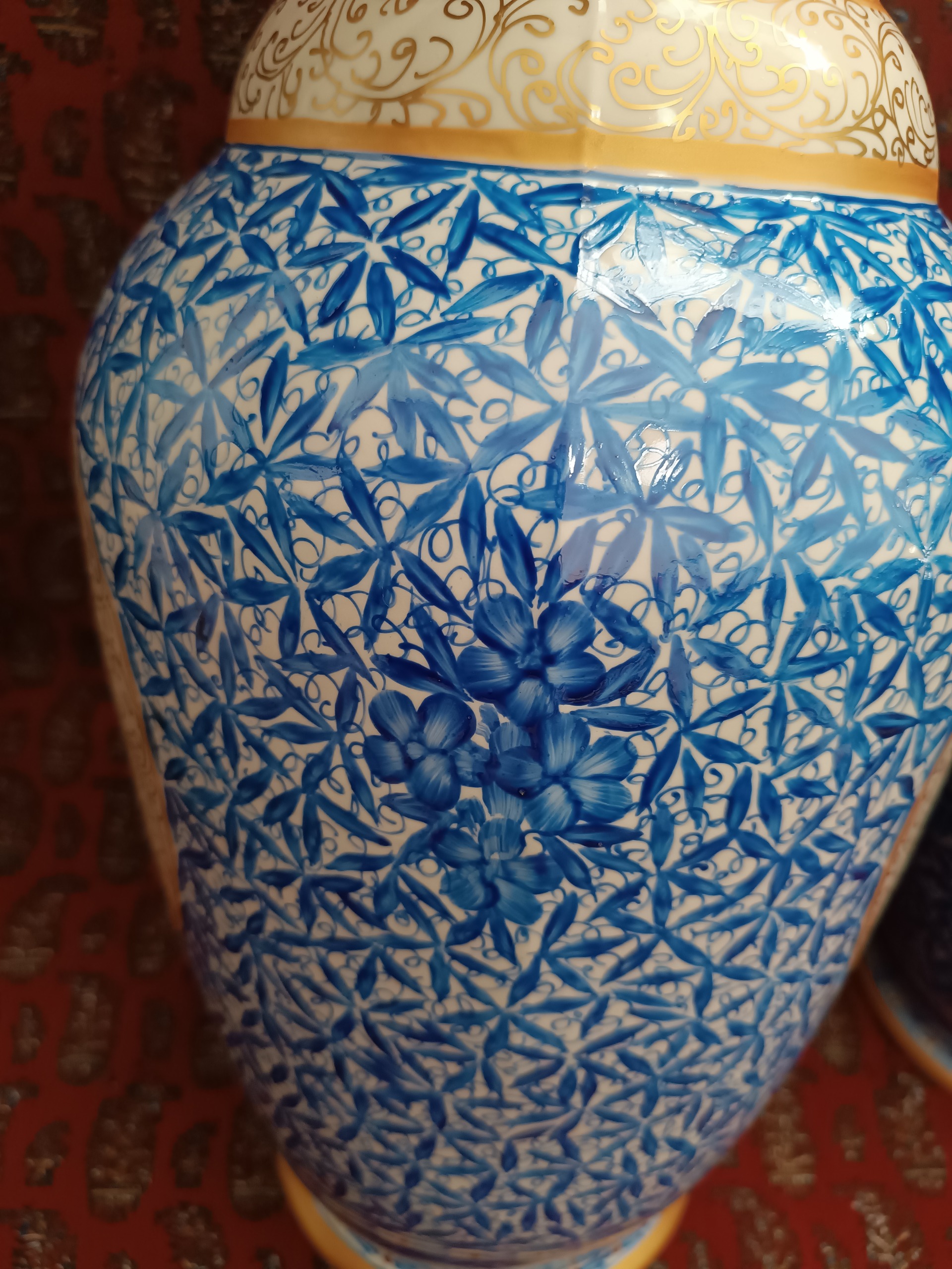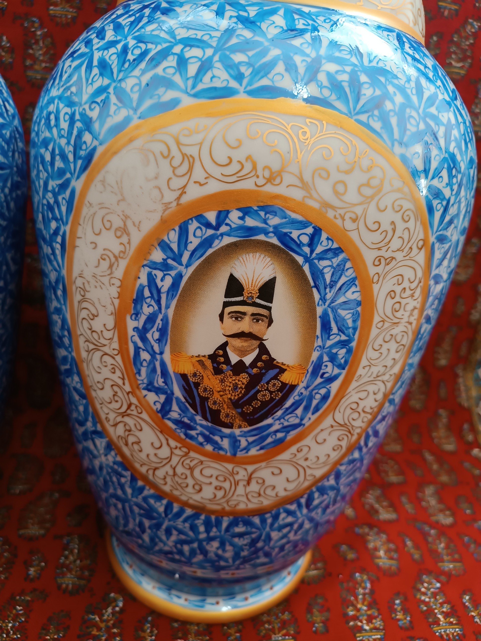 گلدان کنار سالنی قلم آبی تماماً نقاشی دست سالم و بدون شکستگی و لب پریدگی ارتفاع 47 سانت کار کمیاب و کلکسیونی نقاشی استاد یزدان شناسان بی نظیر و کمیاب قیمت برای یک جفت میباشد