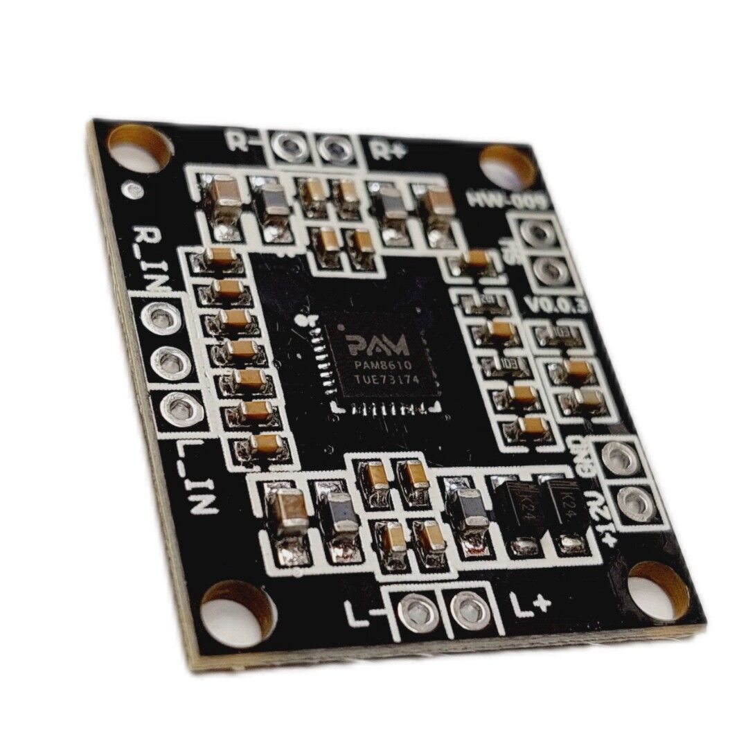 از برای تقویت صدا با طول موج بلندتر از هدفون و ... استفاده می شود و دارای تنوع کلاسی مختلف و توان های مختلف و در ولتاژ و تراشه های گوناگون روانه بازار برای مصارف مختلف پدیدار آمده اند. این ماژول PAM8610 دارای توان خروجی 2*10 وات از کلاس D می باشد که در مجموع به 20 وات می رسد. تراشه بکار رفته برای این ماژول آمپلی فایر PAM8610 است که خروجی استریو بهرمند است. بر روی این ماژول آمپلی فایر محلی برای اتصال ولوم قرار گرفته تا میزان شدت خروجی به وسیله آن بتوانید کنترل بفرمائید. برای بلندگو با توان 10 ولت این ماژول می تواند گزینه مناسبی باشد. به یاد داشته باشید که جهت استفاده درست باید هم اتصال سیم ها به شیوه درست و هم از آداپتور مناسب استفاده نمایید  و همچنین از اسپیکر با آمپدانس مقاومتی متناسب استفاده نمایید تا خروجی صدای سازگار و بهتر را دریافت نمایید. در غیر این صورت شاهد صدای نامطلوب و یا آسیب برد را خواهید شد.