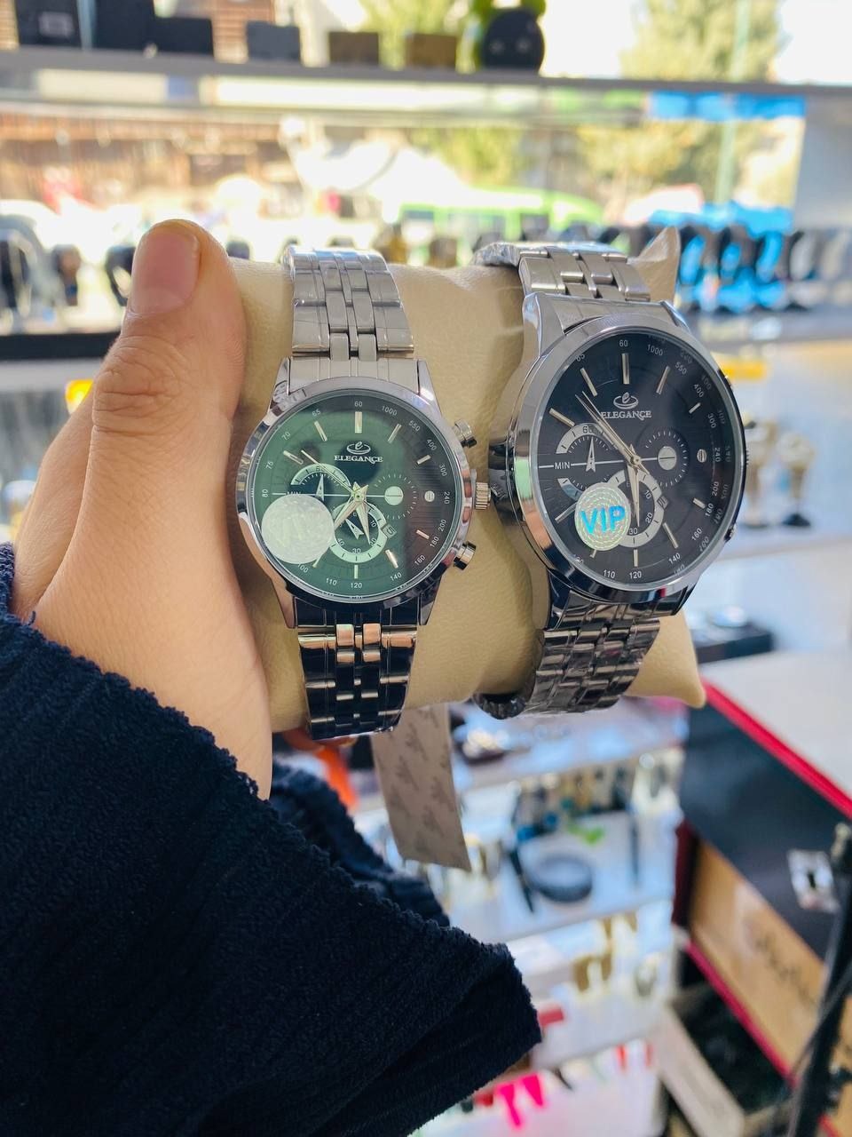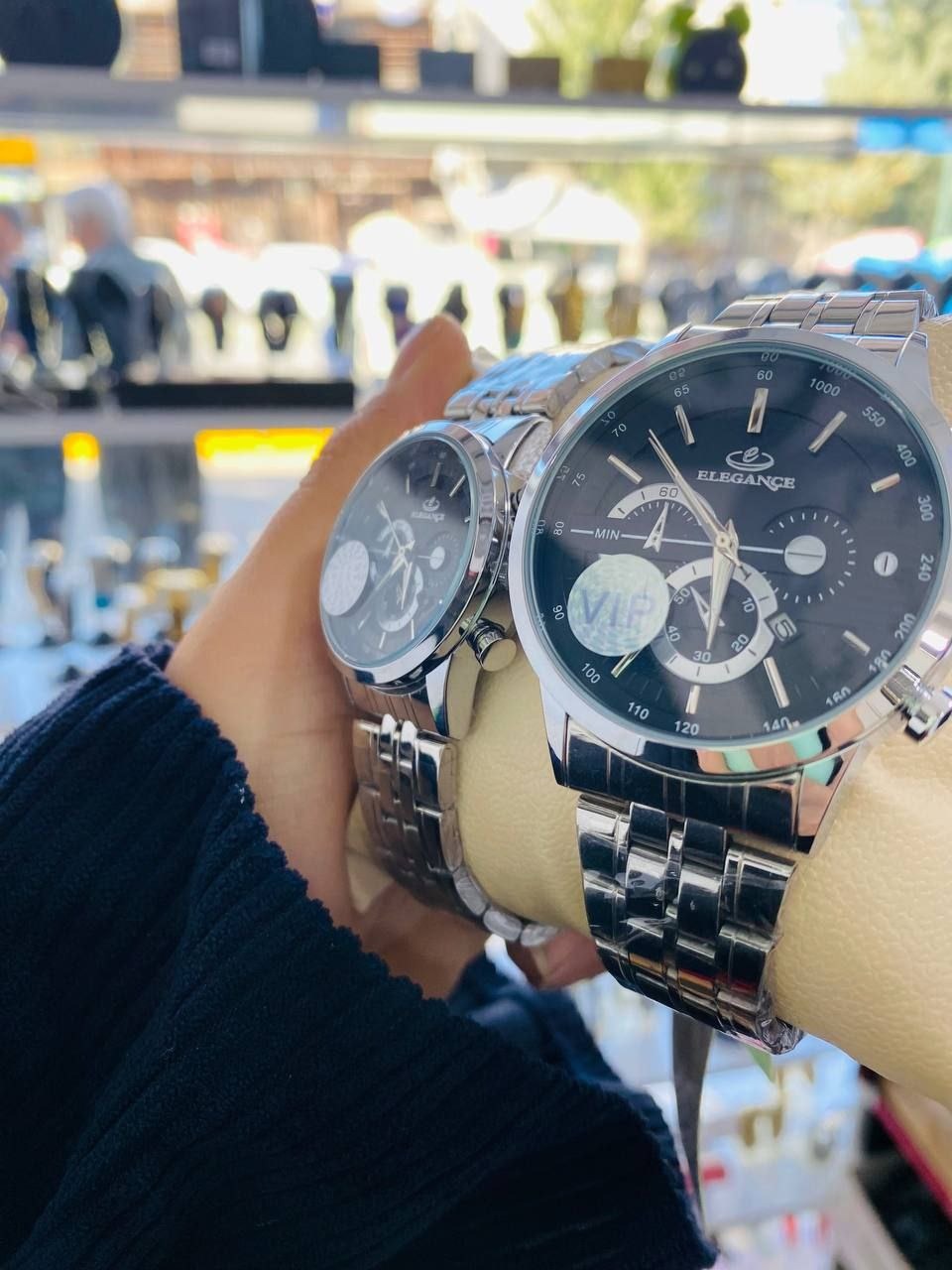 Elegance Twin forever: دو ساعتی که مثل دو نسخه از یک داستان، داستان زمان را با هم تعریف میکنند. هر دو قطعه با بدنهی فلزی براق و بندهای زِرّافیکِ طلا-نقرهای طراحی شدهاند تا روی مچ تو میدرخشند و با هر حرکت نور را به رخ میکشند. صفحههای سیاه/نقرهای با نشانگرهای ظریف و نگینهای درخشان اطراف قاب، به هر دو ساعت شخصیت و عمق میدهند. هر کدام نمایشگر تاریخ دارند و عملکرد کرونوگراف یا نمایشگر ثانویه را در کنار هم ارائه میکنند تا بتوانی زمان را هم دقیقاً اندازه بگیری و هم به زیبایی آن نگاه کنی. حرکت کوارتز با باتری کارآمد، دقتی بینقص به ارمغان میآورد و شیشههای مقاوم در برابر خراش از روزگار روزمره محافظت میکنند تا هدیهای بیبدیل برای تو یا عزیزانت باشد.