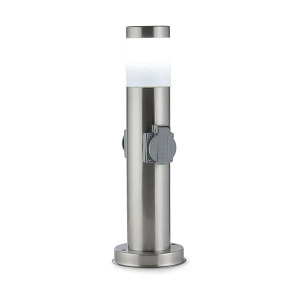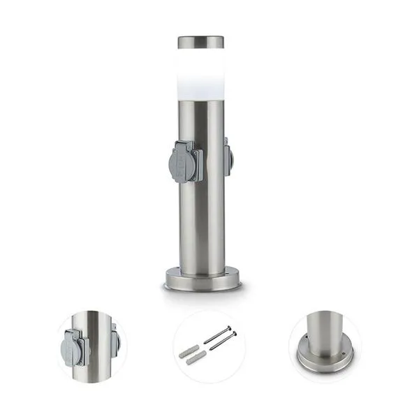 ستون با سوکت دوتایی و لامپ یکپارچه، منبع انرژی و روشنایی خارجی. شکل زیبا، بدنه فولادی ضد زنگ گرد با سوکت های زمین؛ ضدآب طبق IP-44