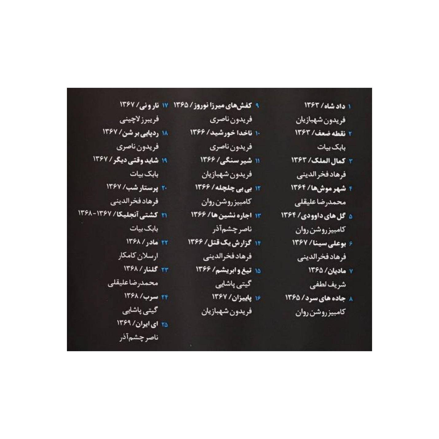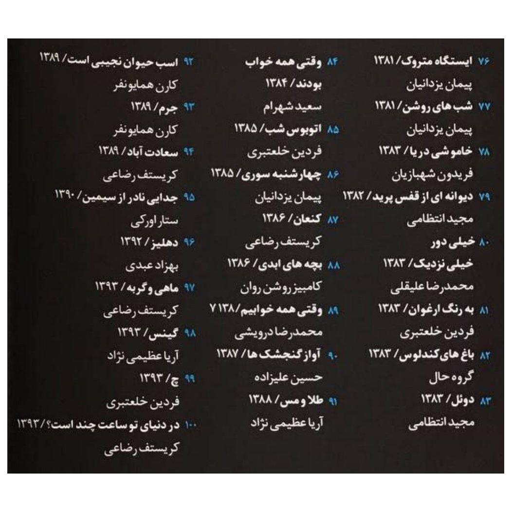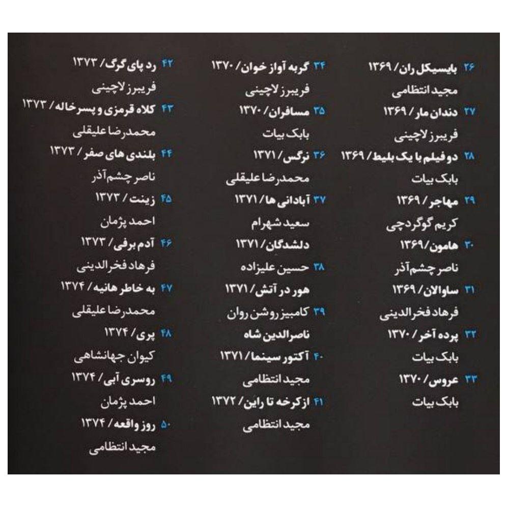 این مجموعه جذاب شامل 100 موسیقی متن فیلم های برگزیده ی سینمای ایران در پس از انقلاب است که فهرست فیلمها و سازنده موسیقی متنها در تصاویر آمده است.