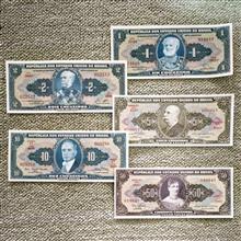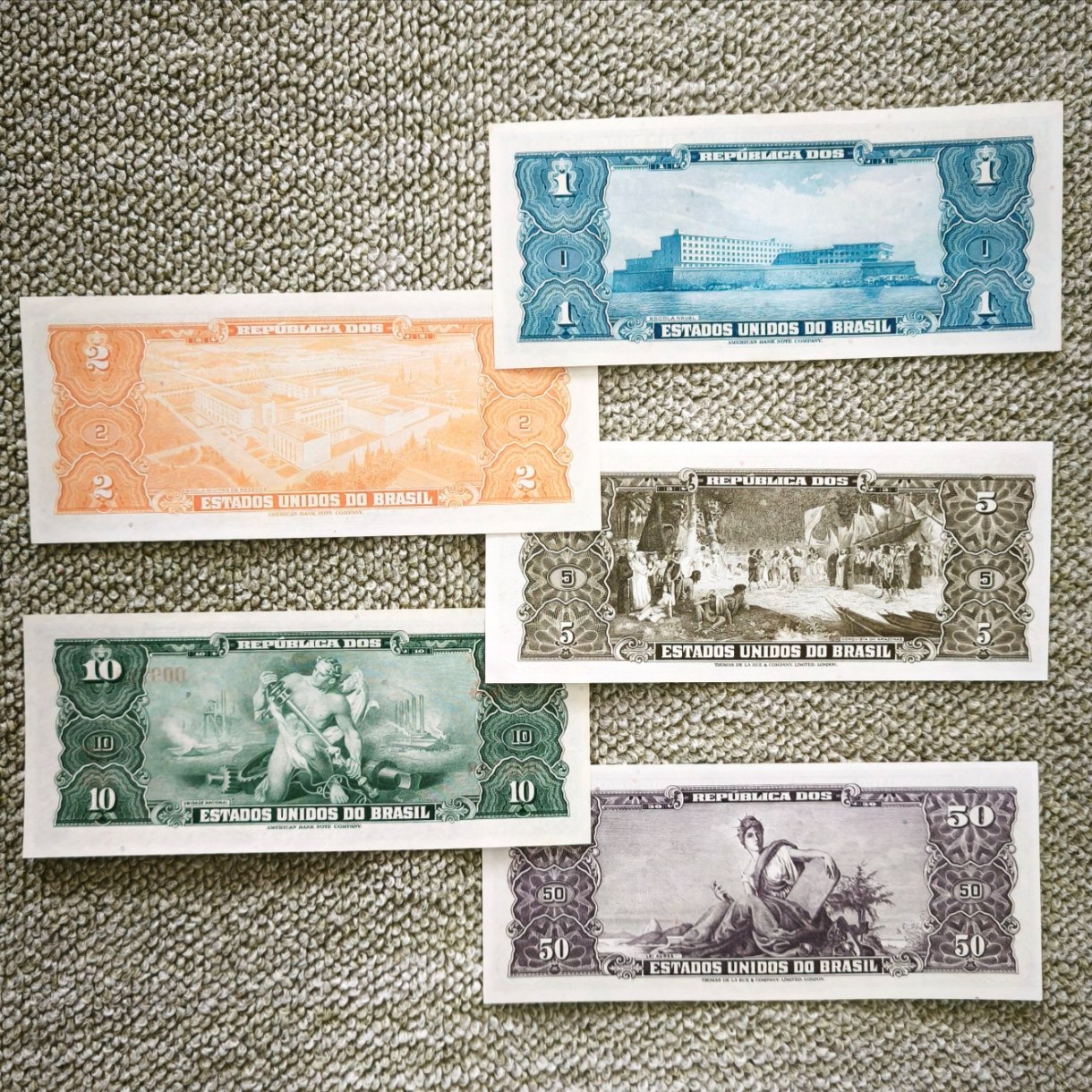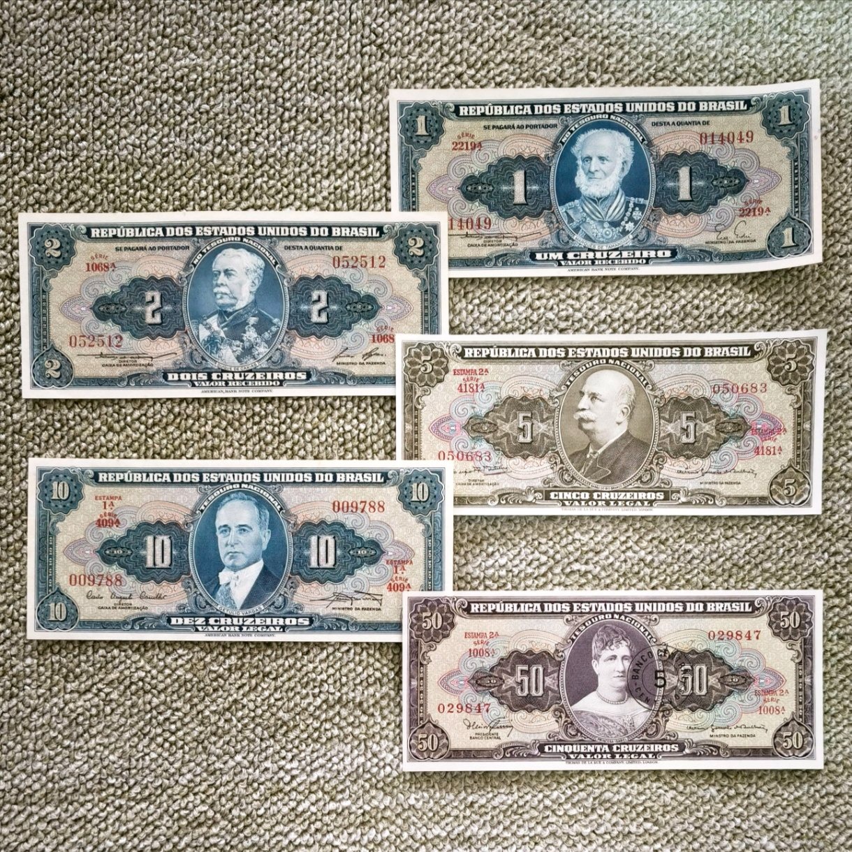 ست پنج برگ بانکی اسکناس کروزیروی برزیل سری امضا چاپی 1959 ـ 1953 میلادی. رقم 50 دارای مهر سورشارژ هست.