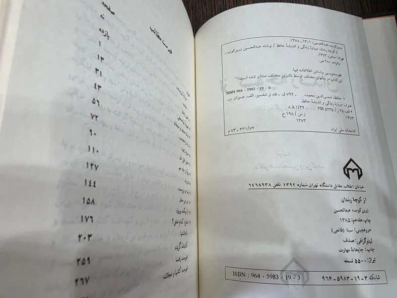 این اثر راه تازهای به شناخت حافظ درباره زندگی و اندیشه او به خواننده ارائه می دهد. این کتاب اولین بار در سال 1349 منتشر گردید و در سال 1386 به چاپ یازدهم رسیده است. دکتر زرینکوب از سال 1341 به بعد در فواصل تدریس در دانشگاه تهران در دانشگاههای هند، پاکستان، آکسفورد، سوربن، پرینستون و به تدریس پرداخت. در ضمن این فعالیتها، به علم ملل و نحل و مباحث مربوط به کلام، نقد ادبی و تاریخ علاقه یافت و آثار ارزشمندی در این زمینه تألیف کرد. دکتر زرینکوب در اواخر عمر به مطالعه و تحقیق و تدریس مباحثی در عرفان، ادیان و تاریخ پرداخت. دهها کتاب و صدها مقاله حاصل تحقیقات ارزشمند او در طی پنجاه سال گذشته بوده است. دکتر زرینکوب کتابی تحت عنوان دو قرن سکوت در مورد حوادث و اوضاع تاریخی ایران در دو قرن اول اسلام (از حمله عرب تا ظهور دولت طاهریان) نگاشته است.