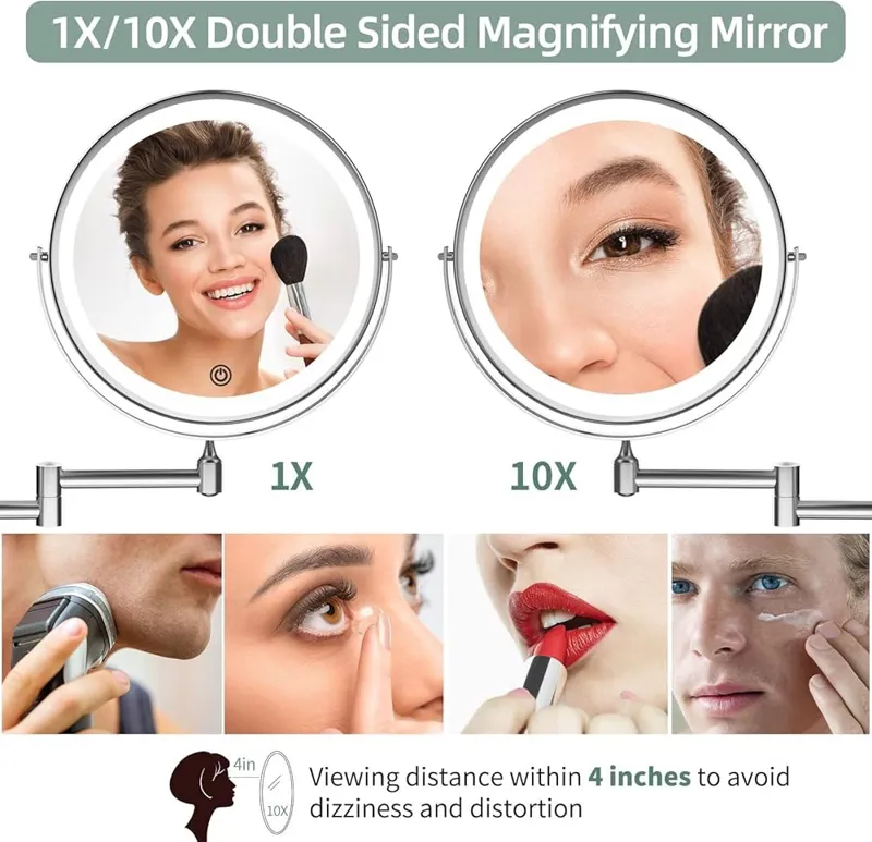 آینه بزرگنمایی دو طرفه 1X/10X: این آینه حمام LED دارای اندازه بزرگ 8 اینچی است که نمای زاویه باز کاملی را ارائه میدهد. آینه بزرگنمایی 10 برابر، نمای نزدیک دقیقی از صورت شما را نشان میدهد که برای استفاده از خط چشم، ریمل یا سایر آرایشهای ظریف ایدهآل است. همچنین میتوانید برای نمای کلی صورت به آینه 1X بروید. لطفاً هنگام استفاده از آینه بزرگنمایی 10 برابر با نور، فاصله 4 اینچی را رعایت کنید تا از سرگیجه و اعوجاج تصویر جلوگیری شود. نورپردازی 3 رنگ و تنظیم نور تدریجی: آینه آرایش دیواری بزرگنماییدار ما برای آرایش، سه گزینه نورپردازی ارائه میدهد: نور سفید، نور گرم و نور سرد. به راحتی دمای رنگ را بین نور گرم و نور سفید تغییر دهید تا ببینید آرایش شما در محیطهای نوری مختلف، مانند روز، عصر و محیط کار، چگونه به نظر میرسد. توجه: میتوانید حالت نور را با یک لمس دکمه تغییر دهید و با فشار طولانی دکمه، روشنایی را تنظیم کنید.