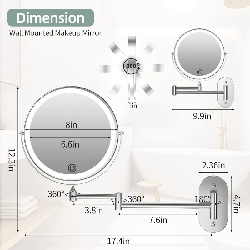 آینه حمام چراغدار دیواری قابل شارژ، آینه حمام 8 اینچی با بزرگنمایی 1X/10X، 3 چراغ رنگی، دو طرفه با چراغهای LED قابل تنظیم، آینه با بازوی کشیده و قابلیت چرخش 360 درجه