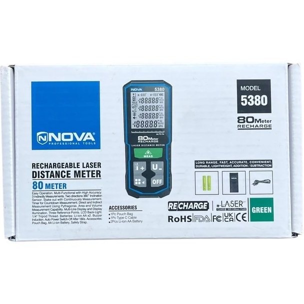 متر لیزری 80 متری شارژی نور سبز نووا مدل 5380 یک ابزار دقیق و پیشرفته برای پروژه های حرفه ای و صنعتی است که با لیزر سبز پرقدرت و وضوح بالا، حتی در محیط های پرنور عملکرد عالی دارد. این دستگاه با برد 80 متر و دقت 2 میلی متر در هر 10 متر، قابلیت هایی مانند اندازه گیری لحظه ای و پیوسته، جمع و تفریق اندازهها، و علامت گذاری در فواصل مساوی را ارائه میدهد. وجود دو تراز دیجیتال داخلی و لیزر ایمن CLASS II با دیود 530 نانو متر، این محصول را به گزینه ای ایدهآل برای مهندسان و پیمانکاران تبدیل کرده است.