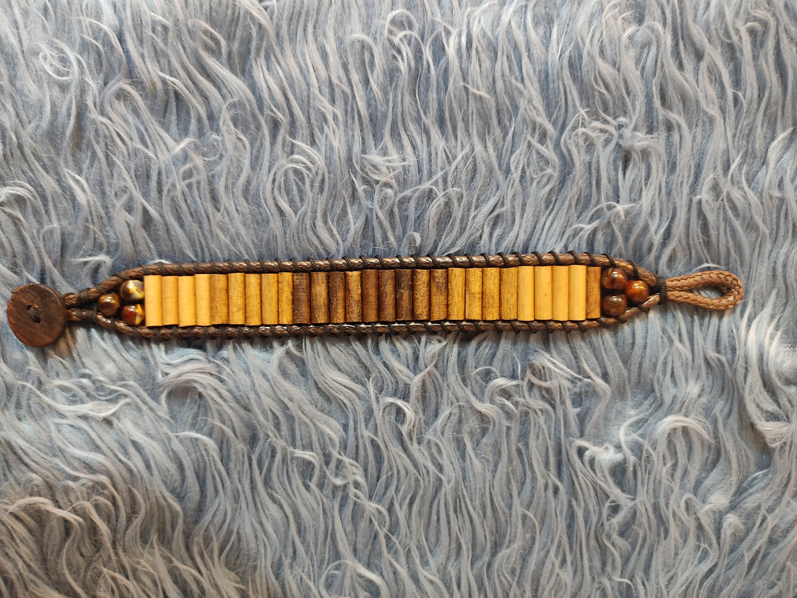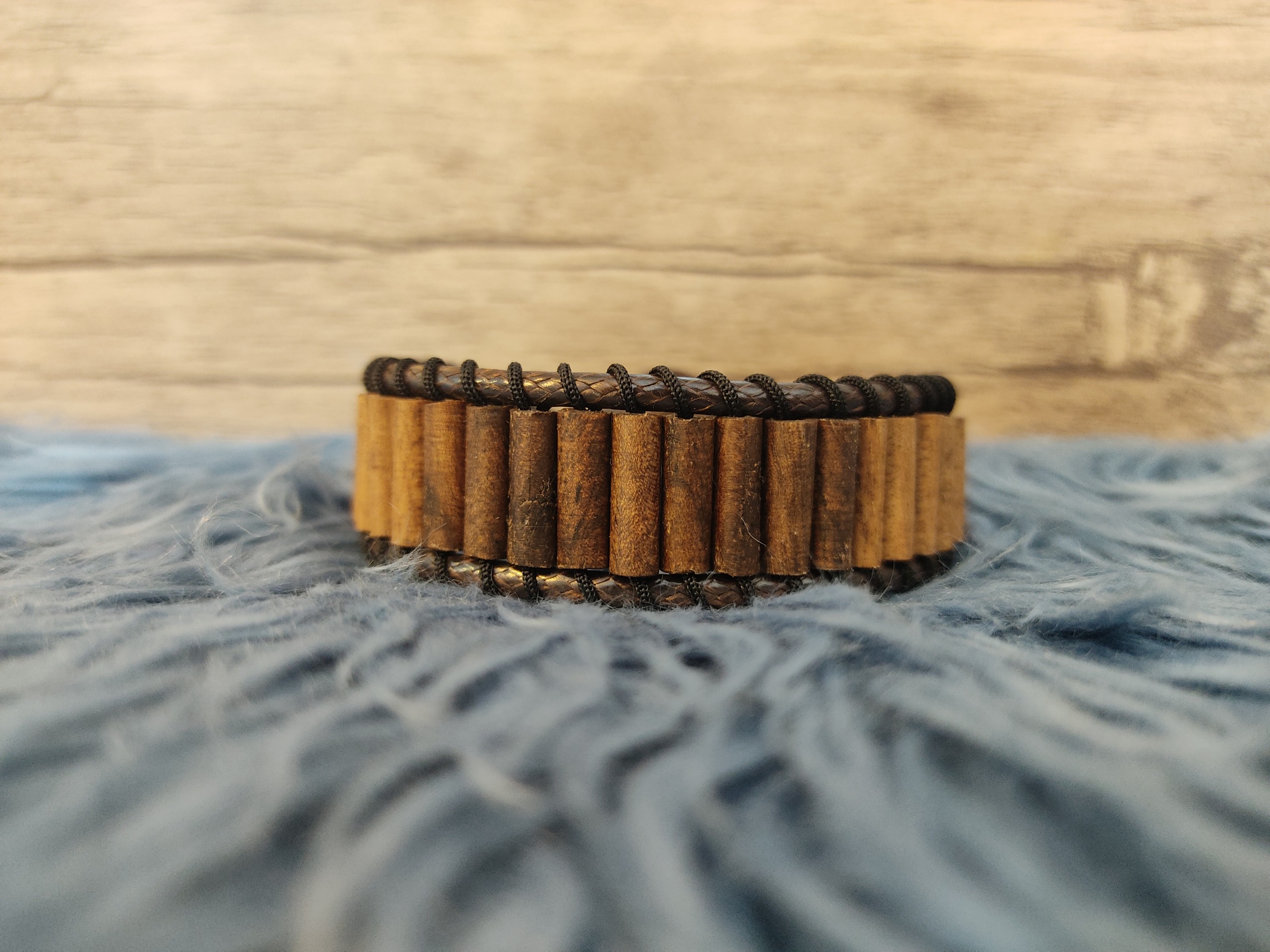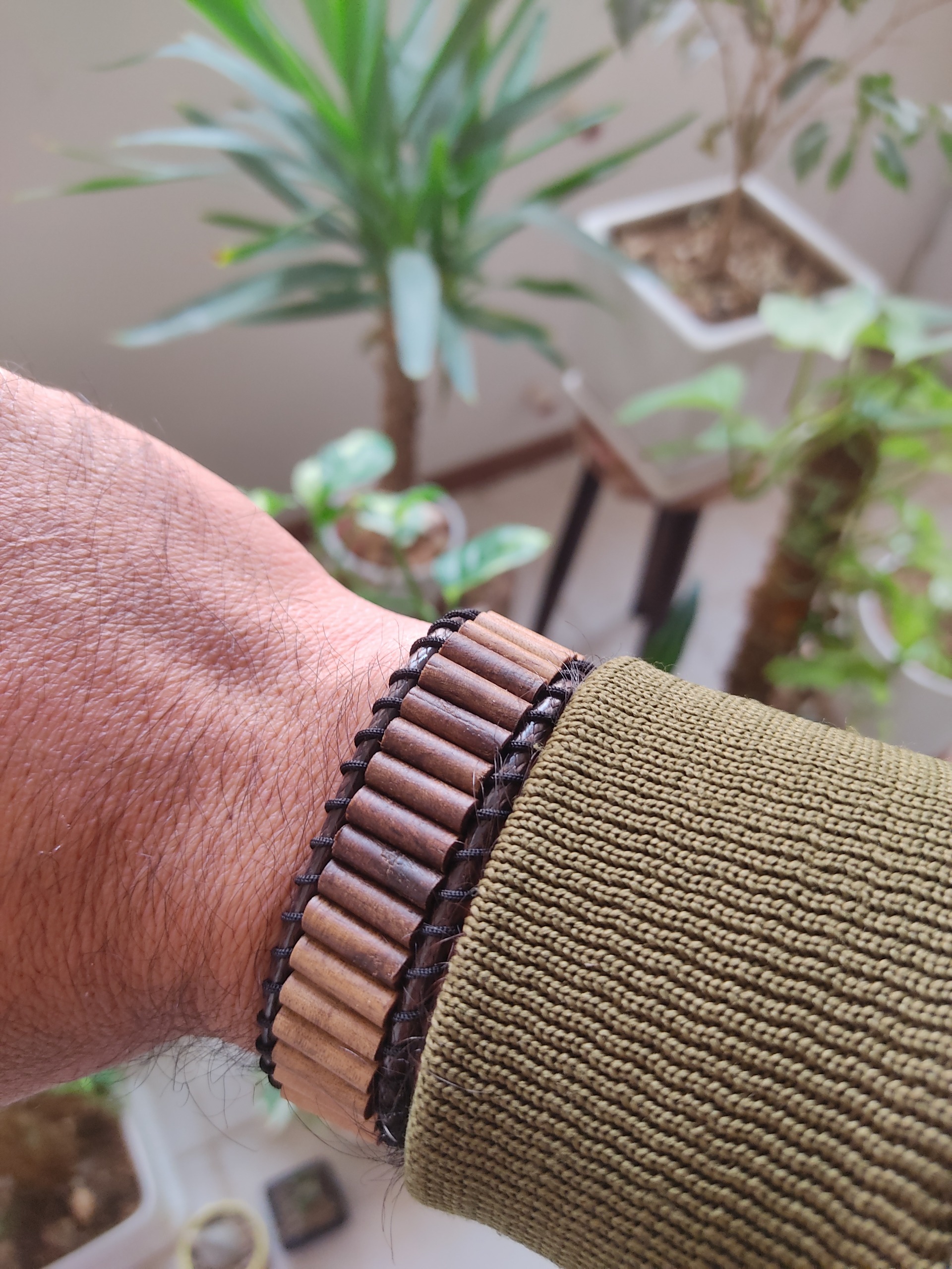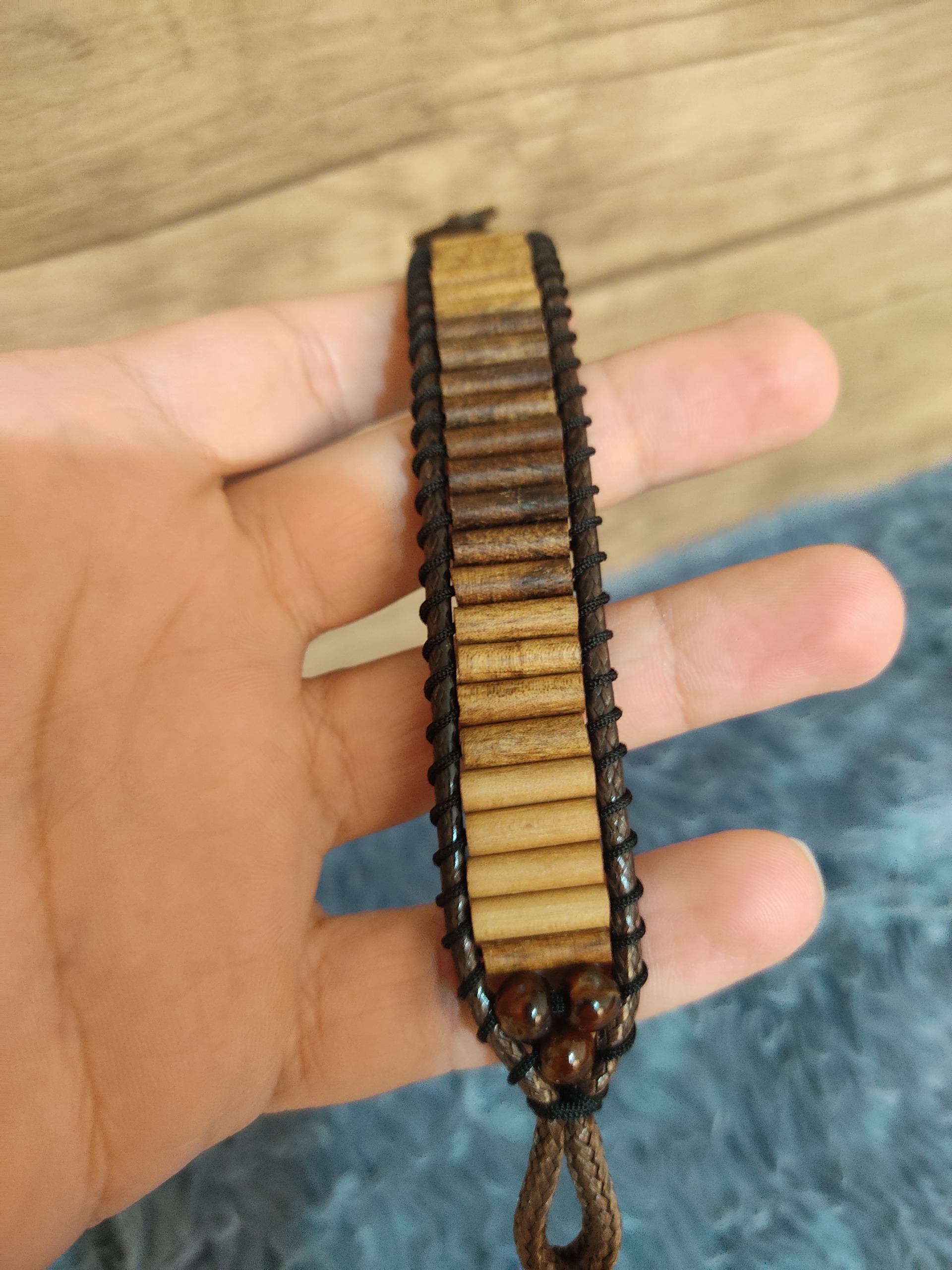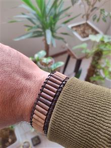 این دستبند از چوب گردو و پسته وحشی ساخته شده است. تمام مهره ها به صورت خراطی و با قطر چهار میلی متر ساخته شده و به دو صورت بستن با دکمه چوبی و قفل خرچنگی موجود هست.