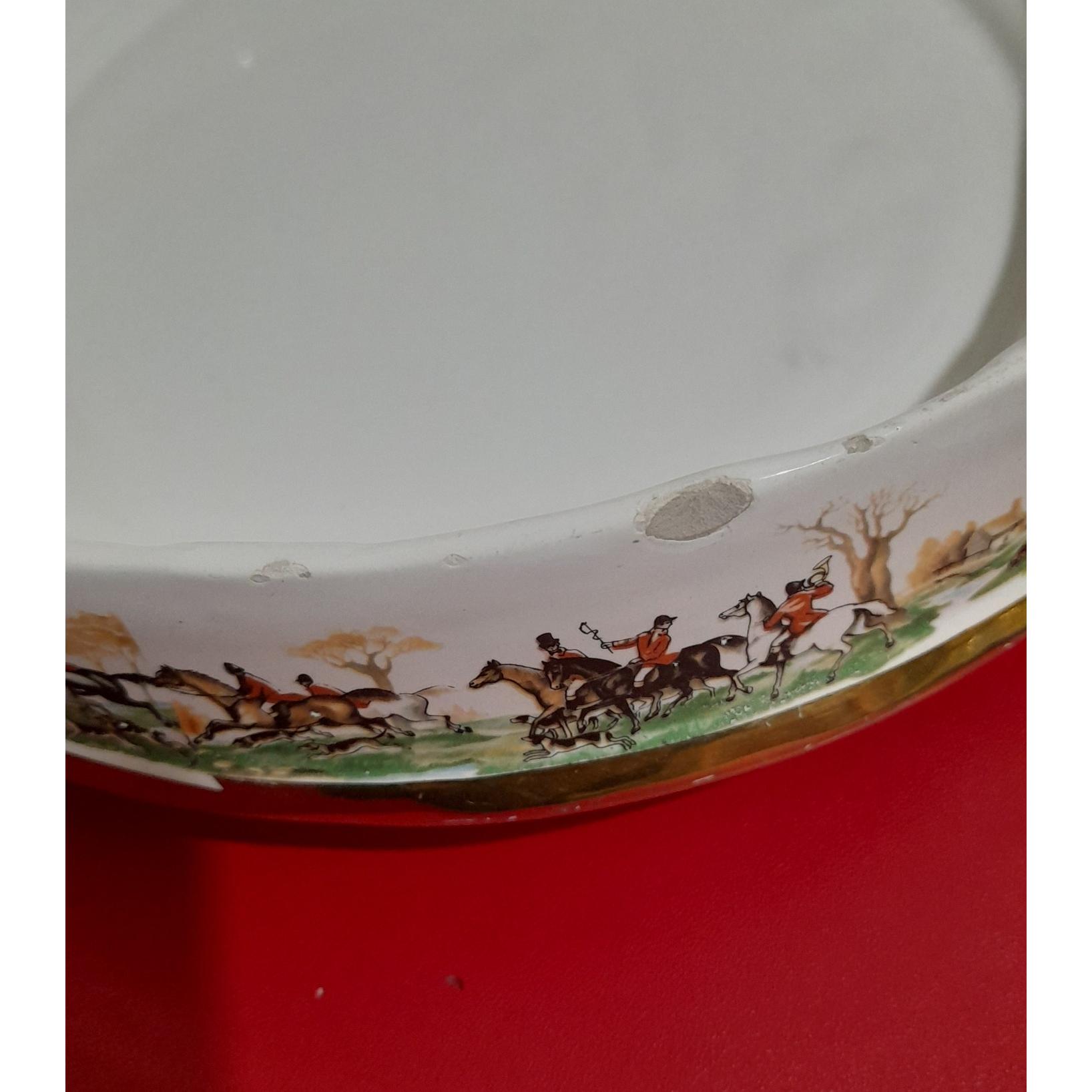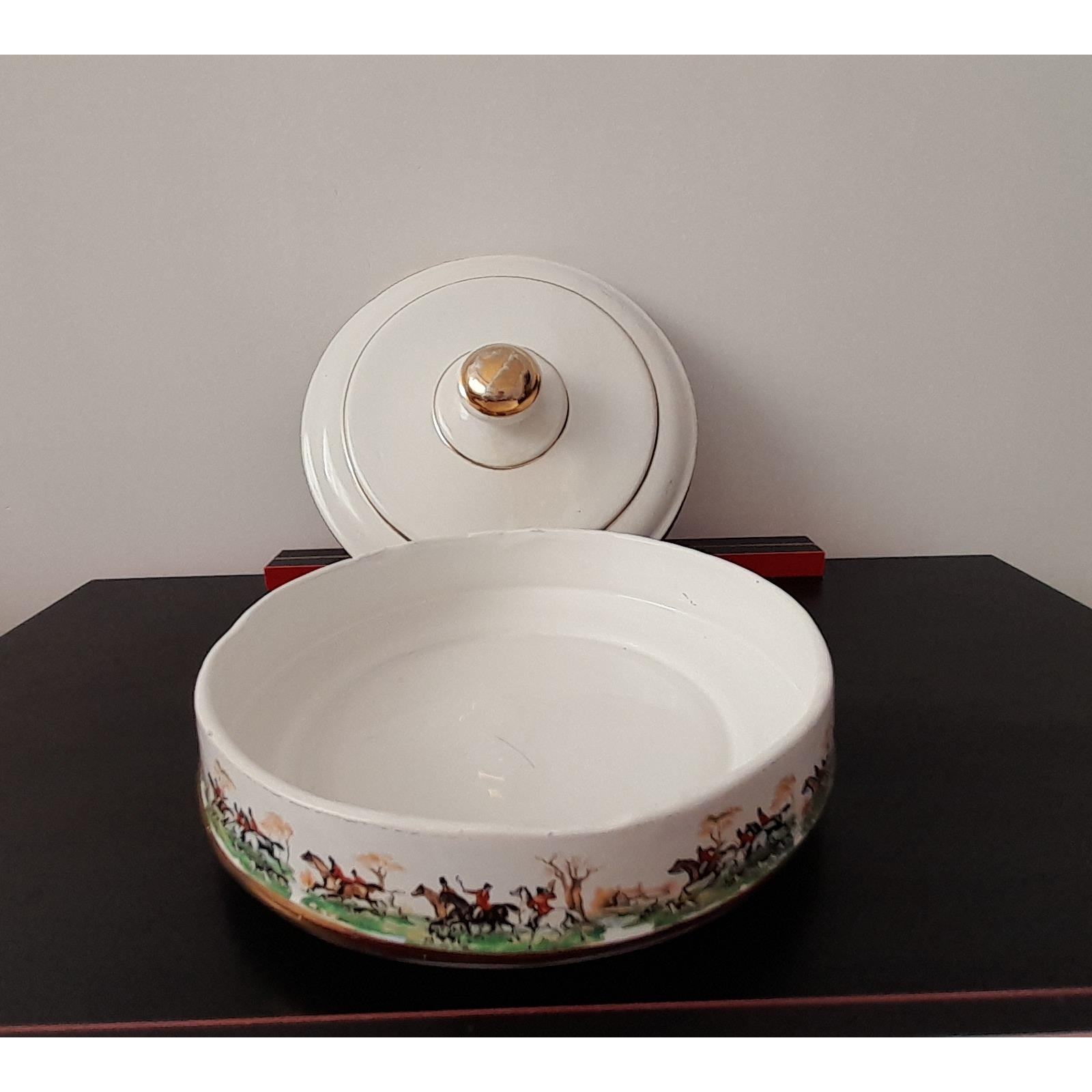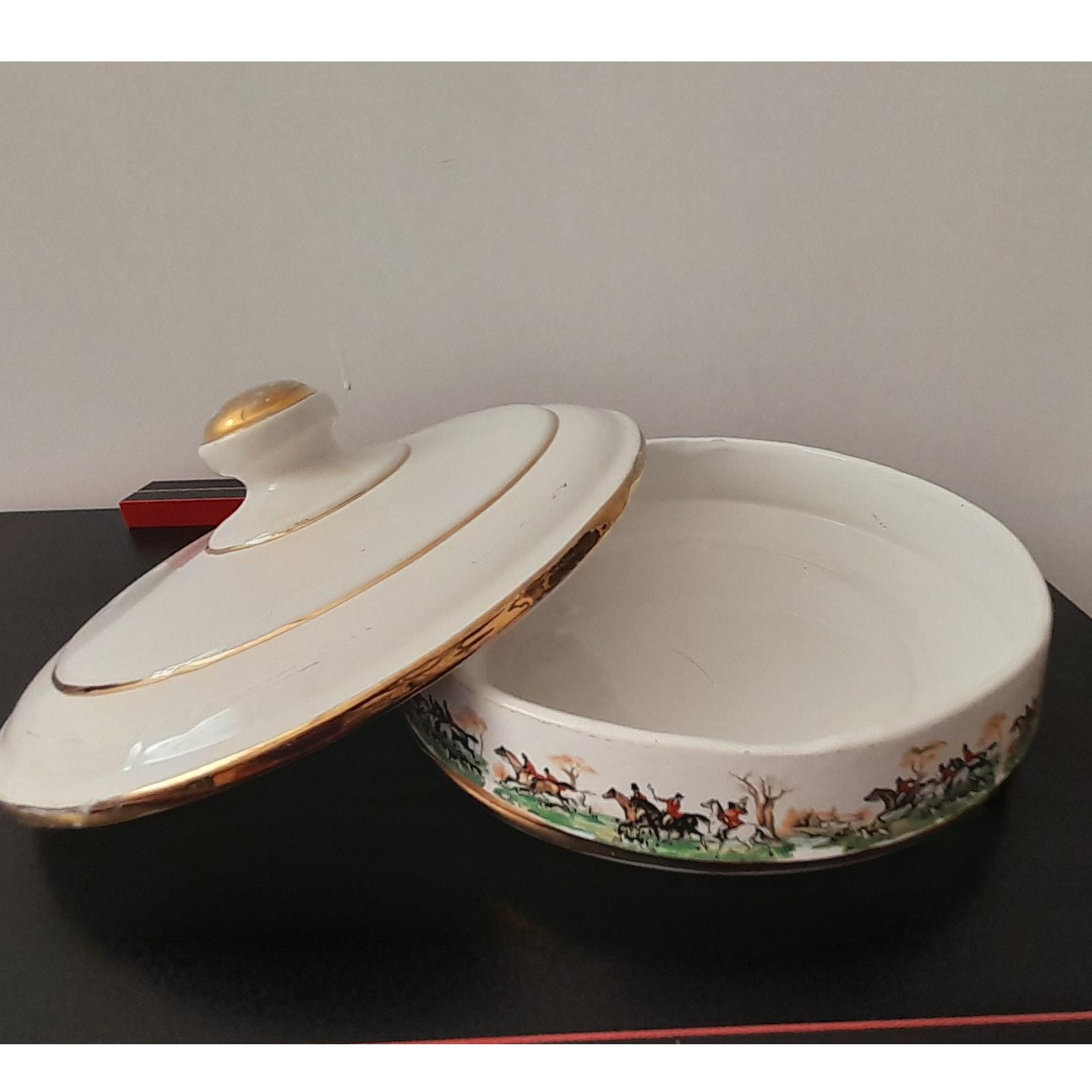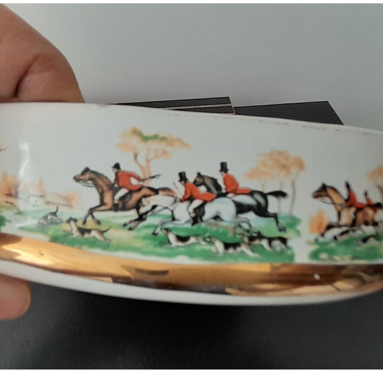 یک ظرف سرامیکی شیک و کلکسیونی با طرح کلاسیک شکار روباه (Fox Hunting)، همراه با درب اصلی. این مدل از روی طرحهای معروف سرامیکهای انگلیسی ساخته شده و دارای تزئینات طلایی دور لبه و نقش رنگی سوارکاران و سگهای شکاری است.