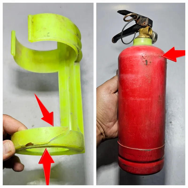 کپسول نو هست و پلمپ کپسول هنوز باز نشده است ، روی بدنه کپسول به علت قدمت دارای خط و خش و رنگ پریدگی و زنگ زدگی میباشد که در تصاویر مشخص است ، به همراه پایه پلاستیکی جهت نصب ( پایه پلاستیکی شکستگی دارد که با فلش مشخص شده است ) ، به همین علت کپسول دست دوم