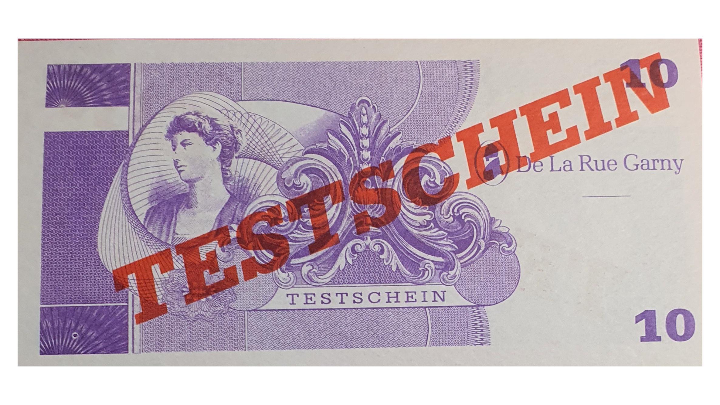 روی آنها عبارت TESTSCHEIN چاپ شده، که در آلمانی یعنی «اسکناسِ آزمایشی». اینها در واقع اسکناسهای نمونه هستند که شرکتهای چاپ پول (از جمله De La Rue) برای آزمایش دستگاهها، جوهر، کاغذ یا آموزش تولید شده اند .