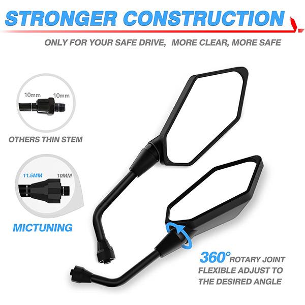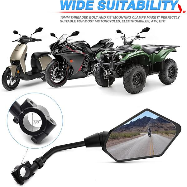 (این جفت آینه چپ و راست) از بدنه ABS ضربهای قوی و میل فولادی سنگین با پیچ رزوهای 10 میلیمتری در جهت عقربههای ساعت و گیره فرمان 7/8 اینچی ساخته شده است که یک پایه محکم است که برای اکثر برندهای موتورسیکلت، کاوازاکی، سوزوکی مناسب