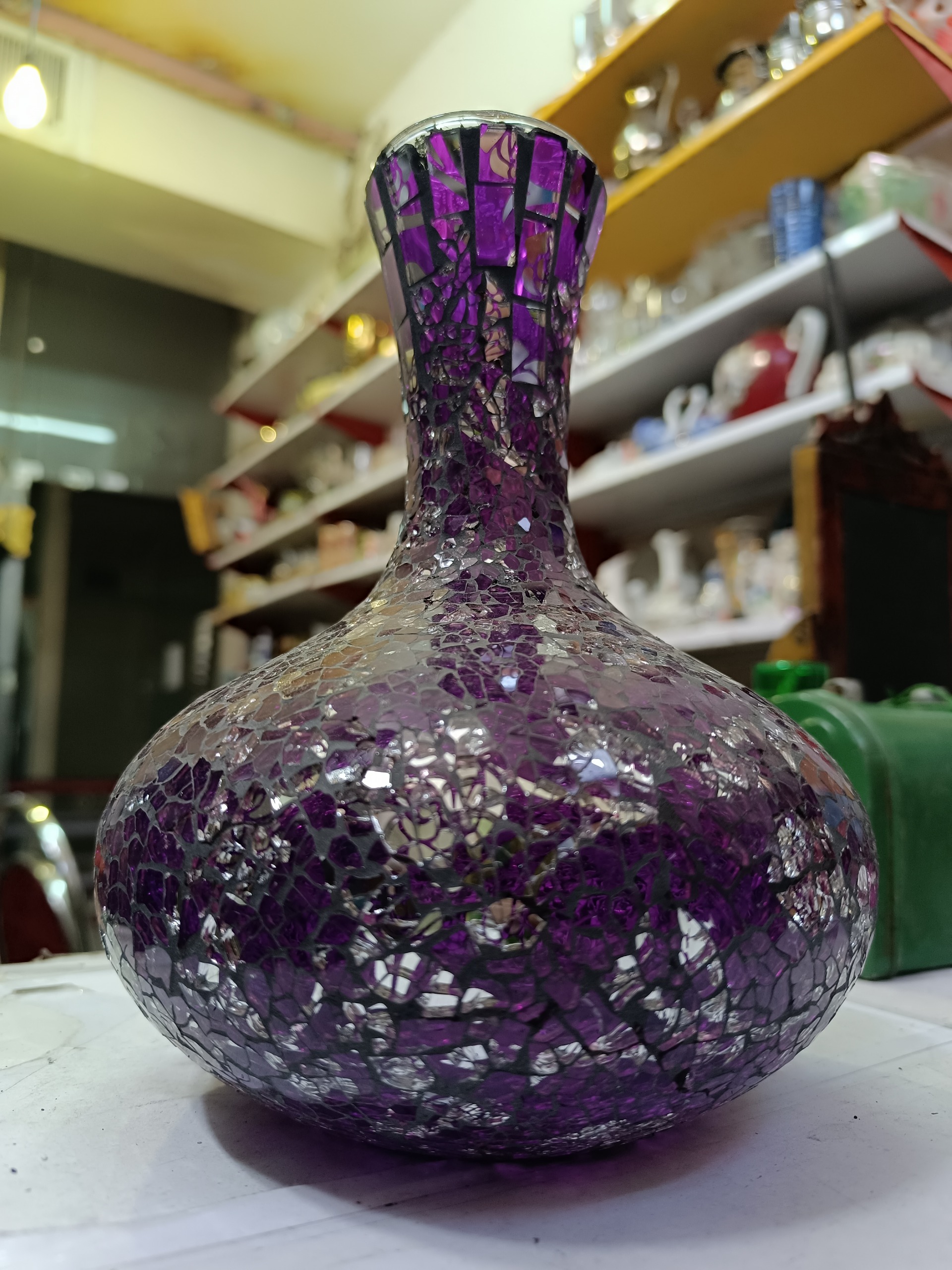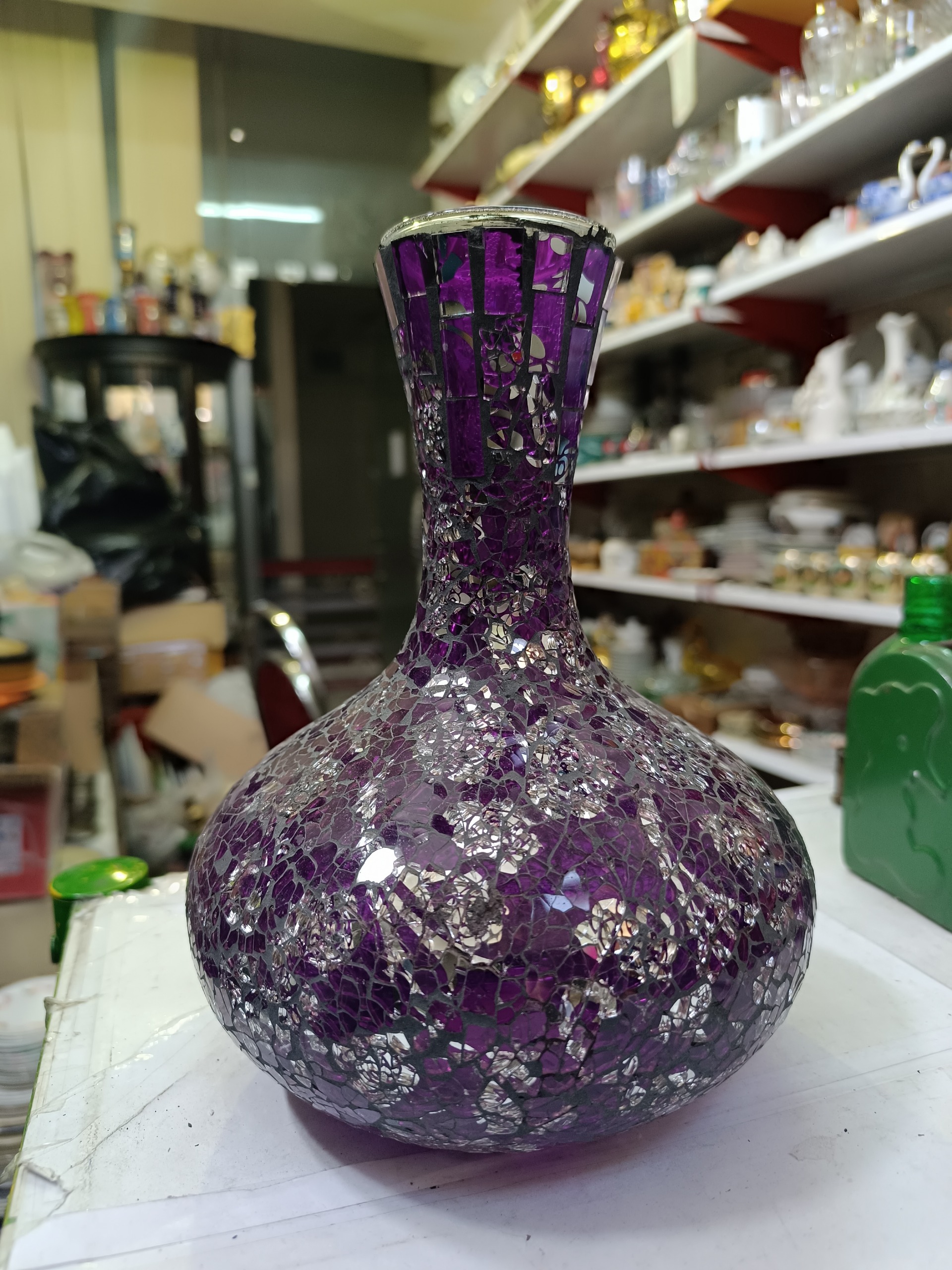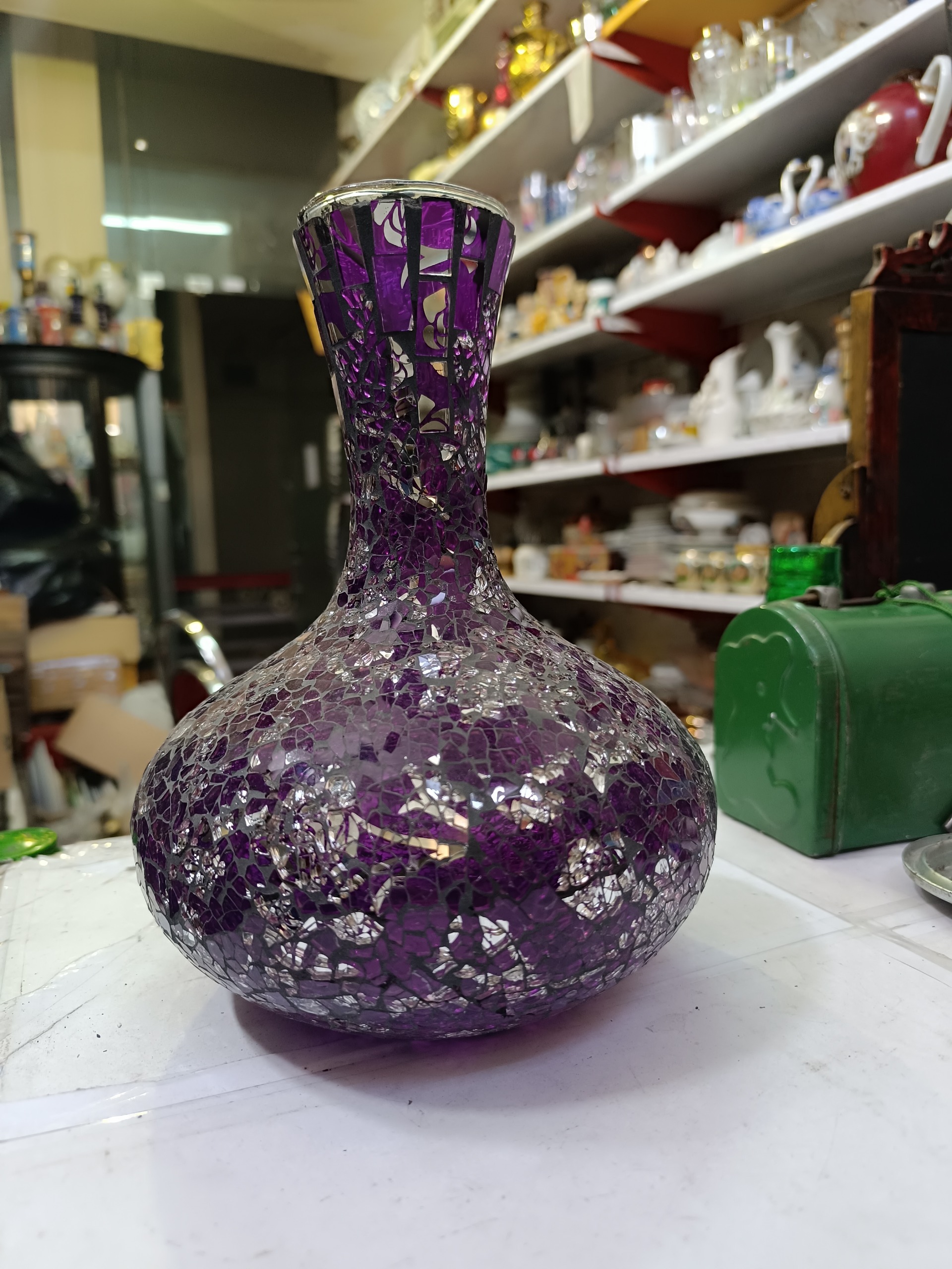 تنگ بلوری آیینه ای هزار تکه با نقش گل ، کار دست ، کلکسیونی ، نمونه این کار به واسطه دست ساز بودن بسیار محدود است . ارتفاع 24/5 سانت