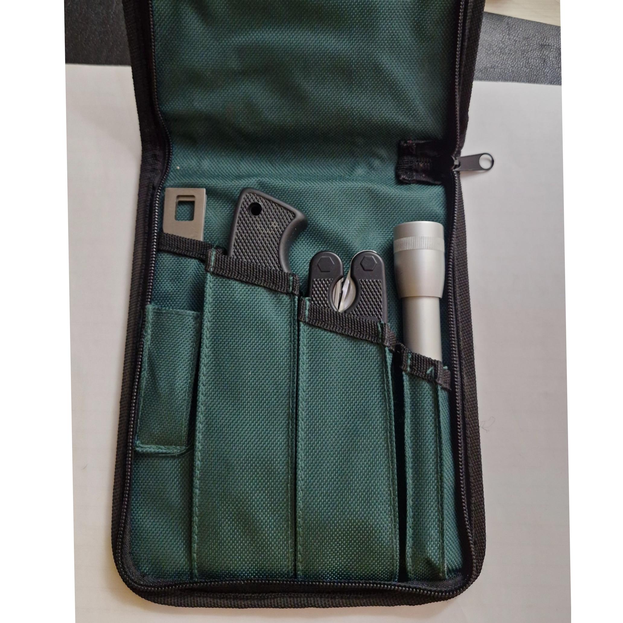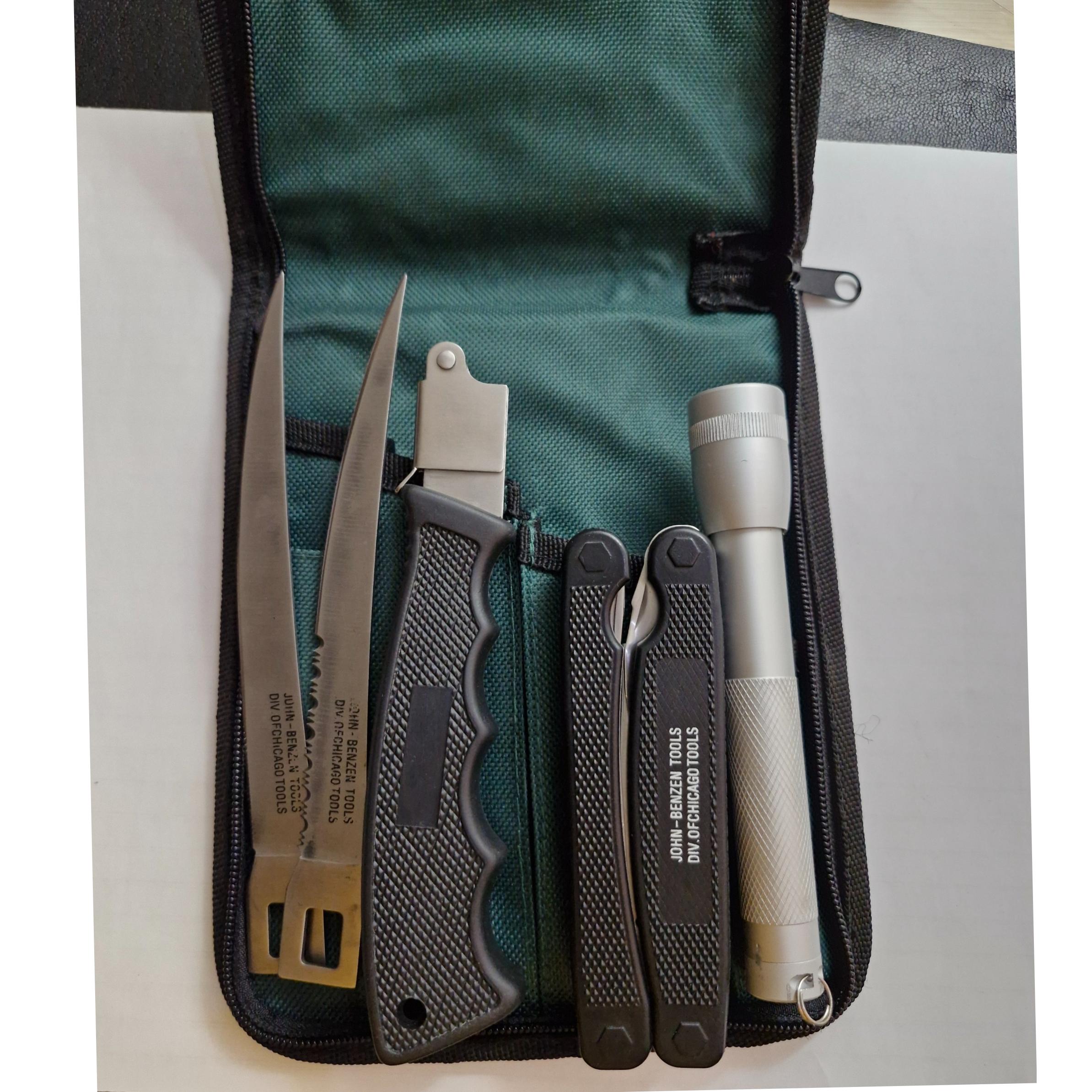 طبق عکس دارای 2 عدد تیغه چاقو اره ای و ساده بسیار تیز و چراغ قوه و انبردست و کیف برزنتی خود کالا اصل امریکا
