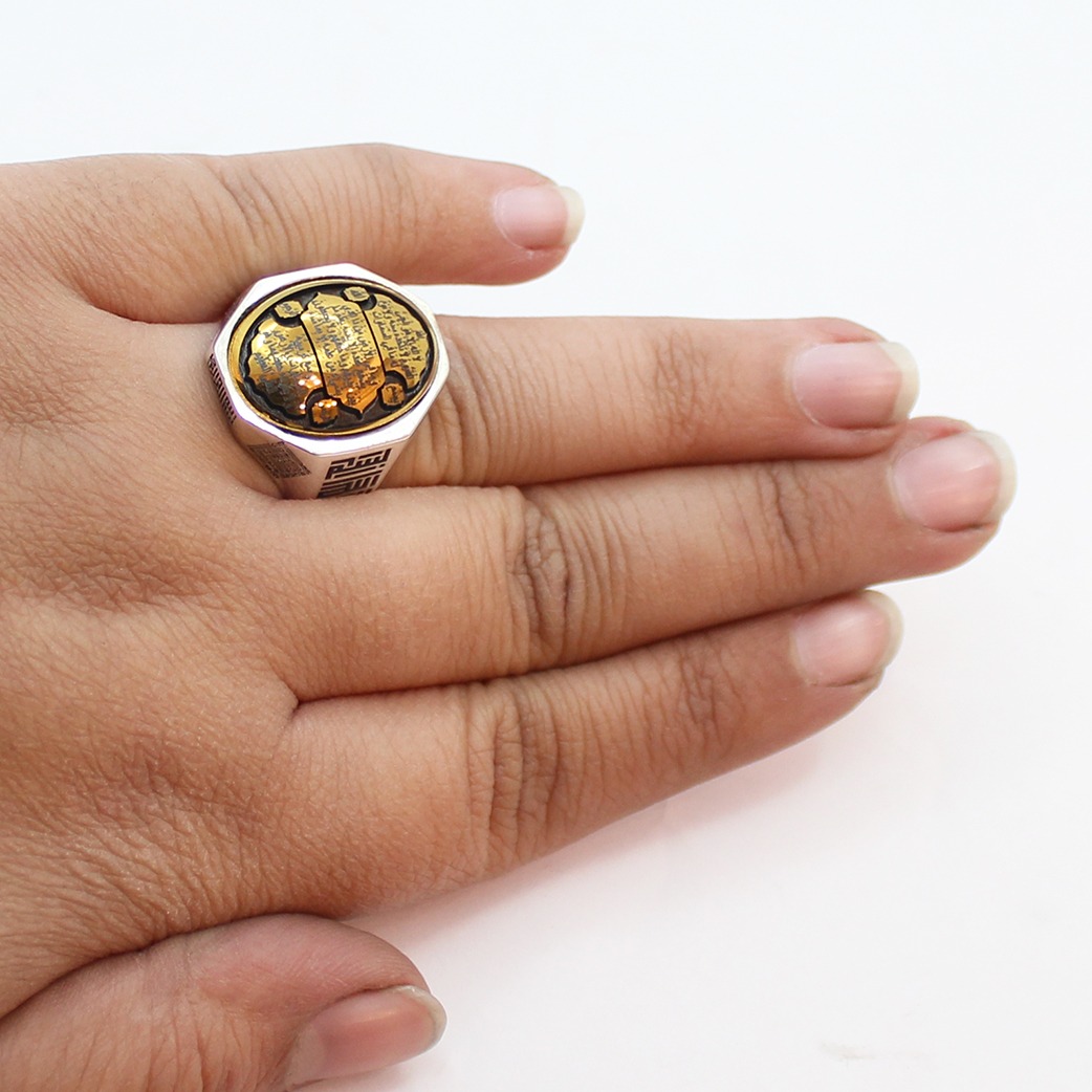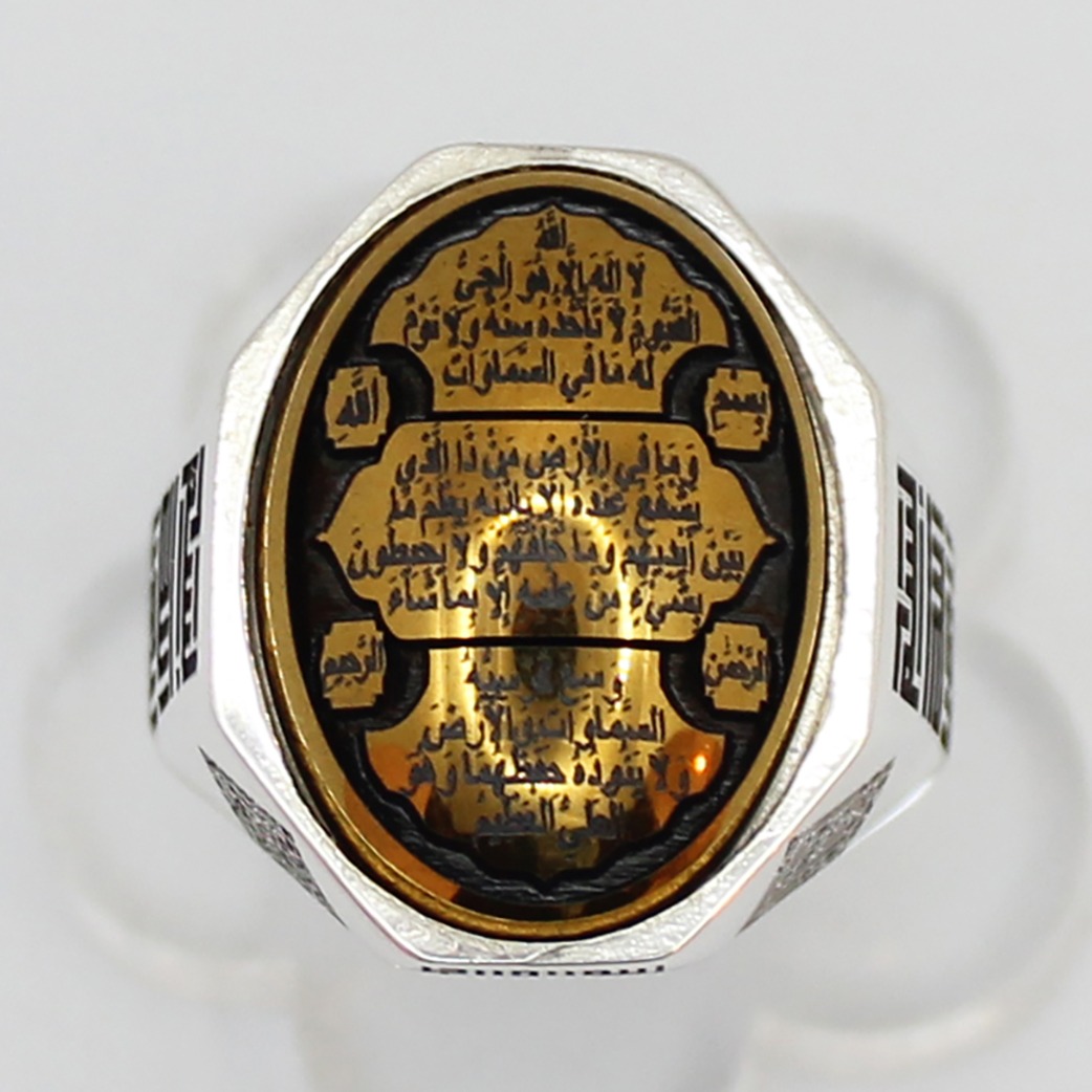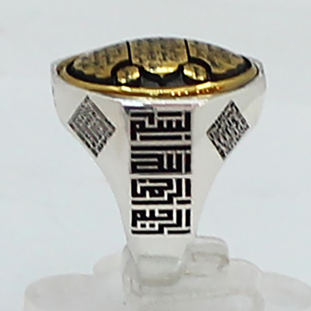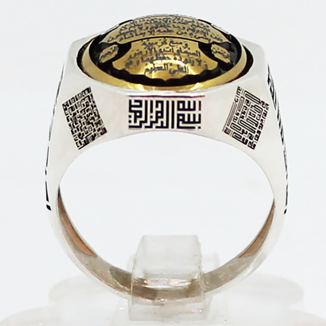 انگشتر نقره 925باقلم زنی چهارقل با خط کوفی وسنگ حدید به رنگ طلایی باحکاکی آیة الکرسی