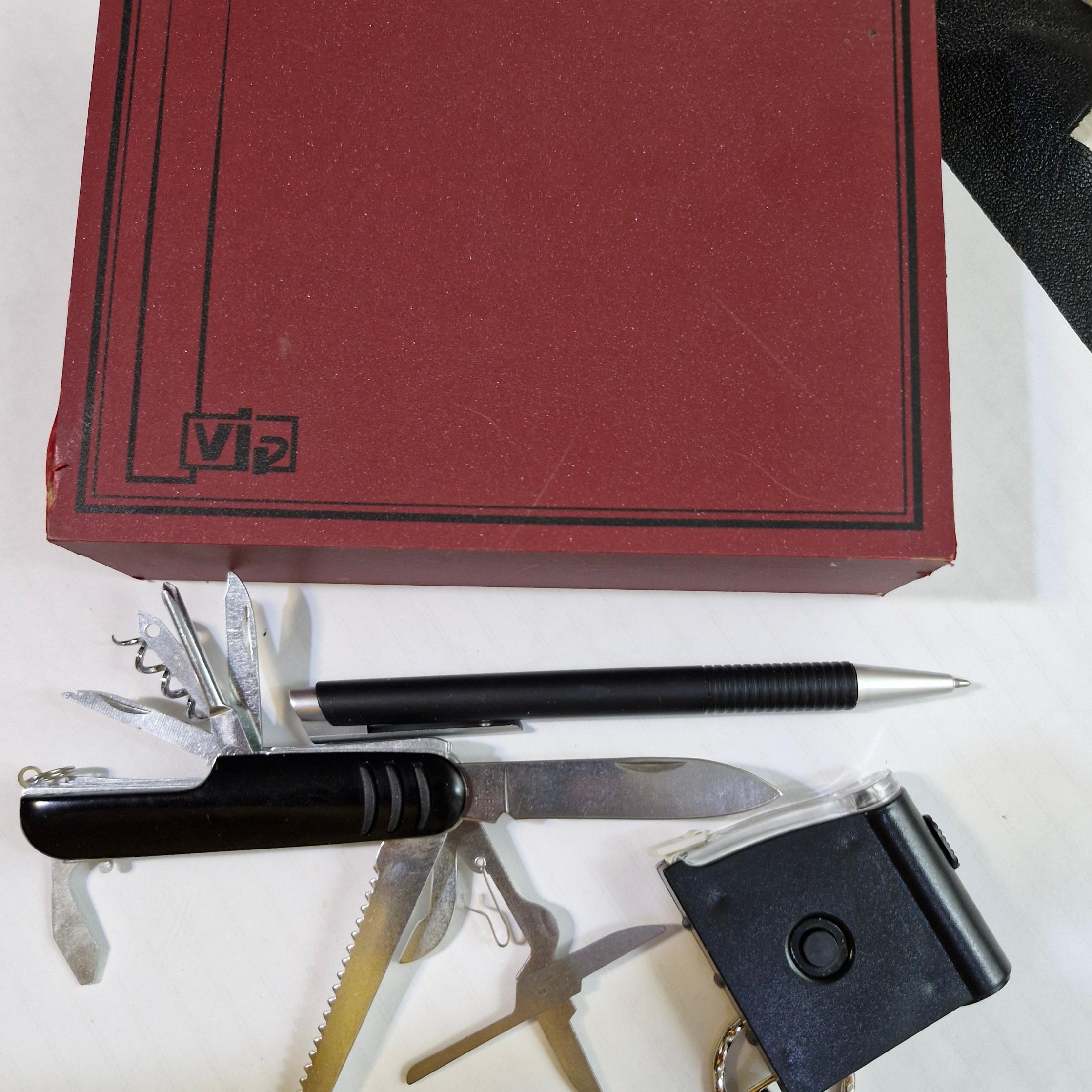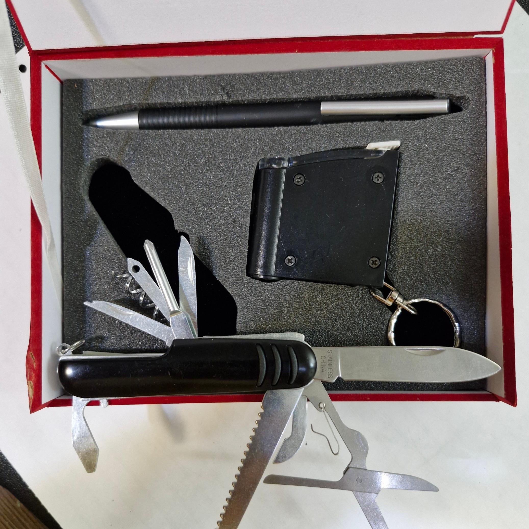 طبق عکس بسیار زیبا شامل متر و چاقوی چند کاره و خودکار و جعبه محکم خود کالا فقط روی چاقو آرم تبلیغاتی دارد