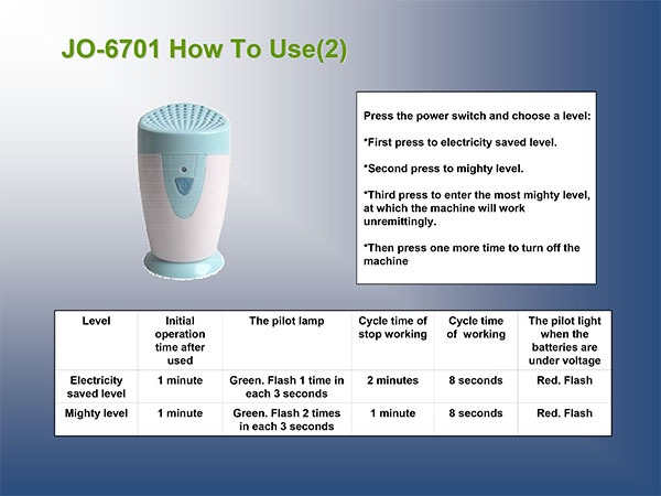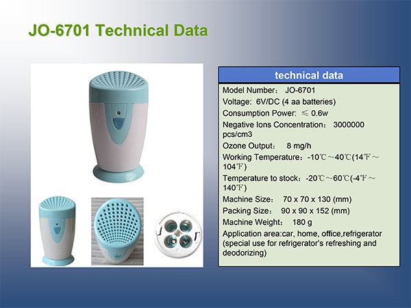 دستگاه تصفیه هوای JO-6701 با طراحی علمی و دقیق، یک راهحل بینظیر برای حذف بوهای ناخوشایند، دود، گرد و غبار و عوامل بیماریزا در محیطهای مختلف است. این دستگاه بیسیم با تولید یون منفی و اُزن، هوایی پاک و تازه را برای شما فراهم میکندبدون نیاز به برق و با مصرف انرژی بسیار پایین.