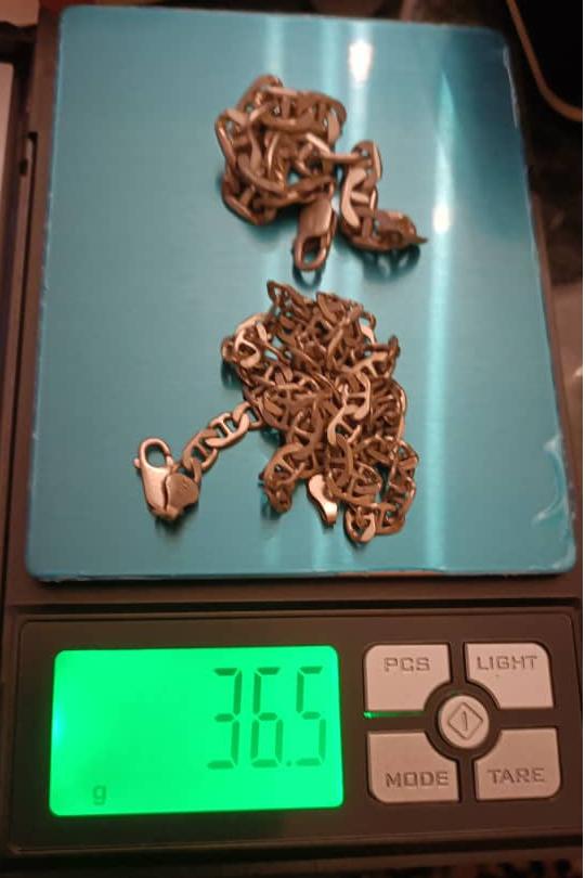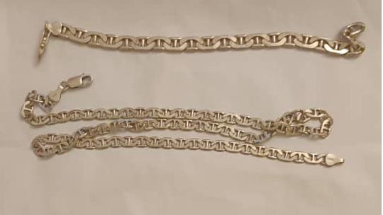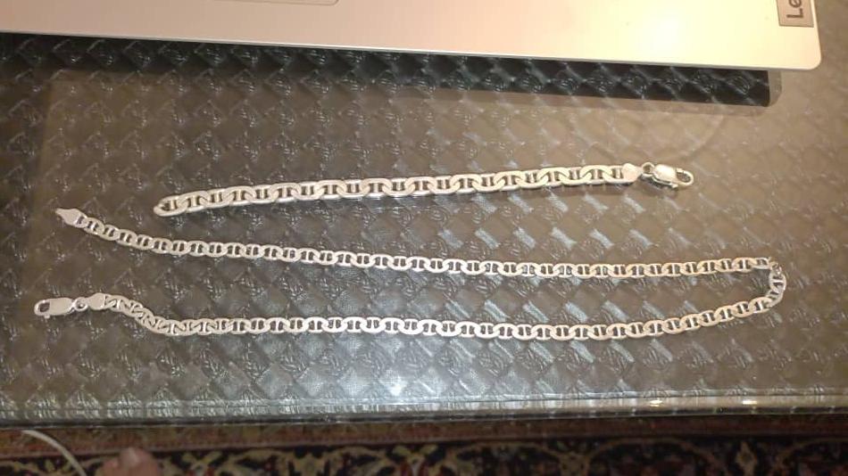گردن بند و دست بند زنجر تمام نقره ساخت ایتالیا، عیار 0925، وزن 36.5 گرم، طول گردنبند 53 و دستبند 18 سانت
