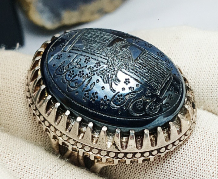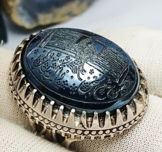 انگشتر حدید صینی اصل و طبیعی خوشرنگ و زیبا با حکاکی تصویر مولا علی و درب خیر و خط لا فتی الی علی