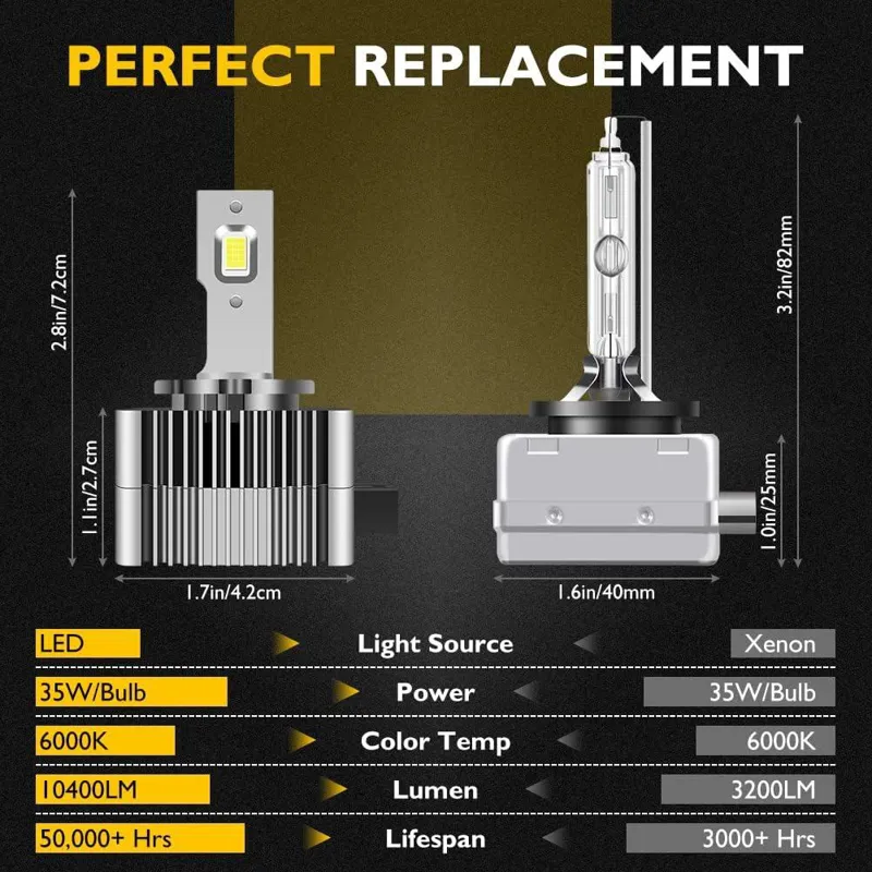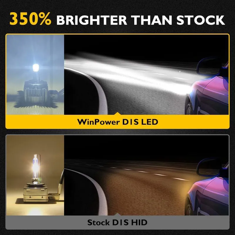 350% روشنایی لامپ چراغ جلو WinPower D1S با تراشههای سفارشی 4075 استفاده میشود که میتواند از 35 وات برای رسیدن به 5200 لومن در هر لامپ (10400 لومن در هر جفت)، 6000 کلوین سفید فوقالعاده سرد، 350 درصد روشنتر از لامپ D1S HID استفاده کند .