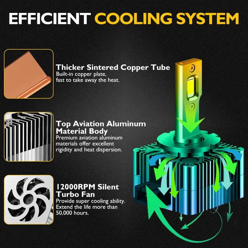 سیستم خنک کننده کارآمد هر کیت LED D1S از آلومینیوم هوانوردی 6063 ساخته شده است ، لوله های مسی داخلی خنک شده و با فن توربو سرعت بالا 12000، اینها یک سیستم اتلاف گرما قدرتمند را ارائه می دهند، به لامپ اجازه می دهد تا سریع خنک شود و خروجی لومن کامل را حفظ کند .
