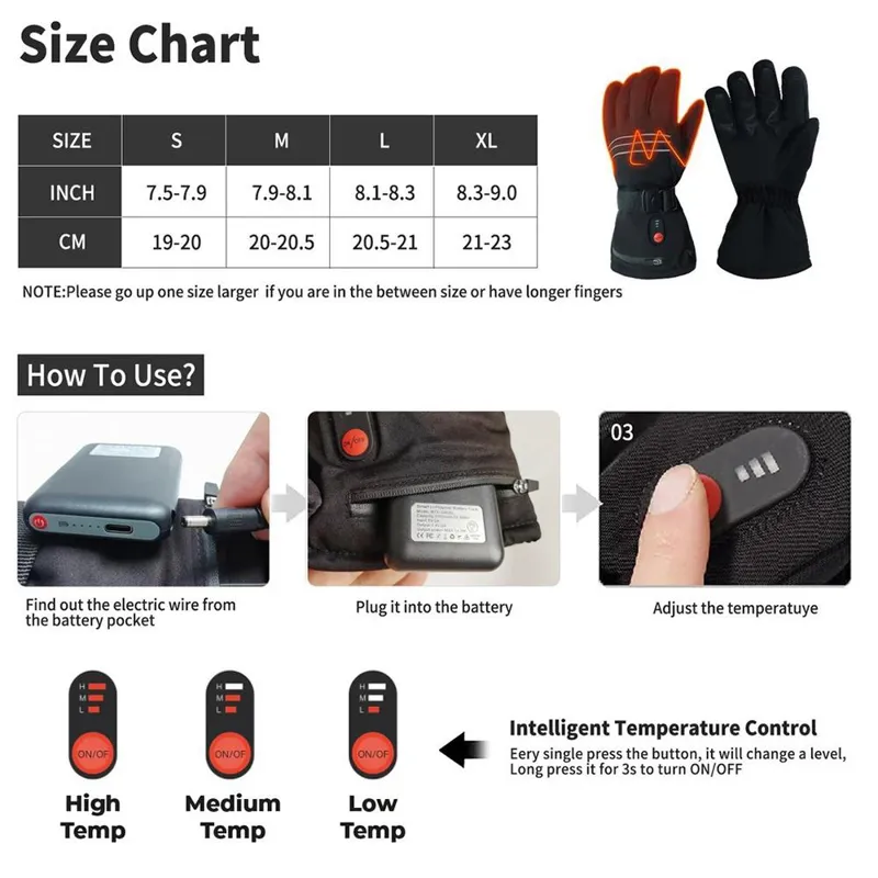 به راحتی 3 تنظیم دما (بالا 149 فارنت، متوسط 131 فارنهایت، پایین 113 درجه فارنهایت) را با یک فشار ساده 3 ثانیه ای دکمه ON/OFF تنظیم کنید. این دستکش های شارژی با ارائه حداکثر 4 ساعت تضمینی حرارت مداوم، دستان شما را برشته نگه می دارد و باعث می شود از بردن لذت