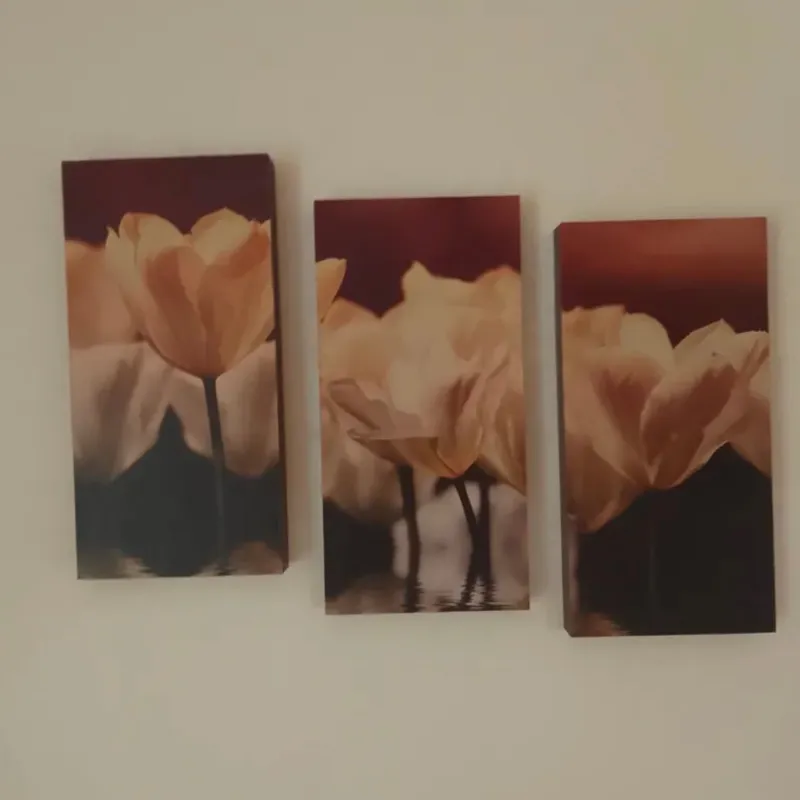 تابلو سه تکه 3 تیکه مشکی کرم زرد گل لاله ابعاد هر قطعه 20در40 شاسی