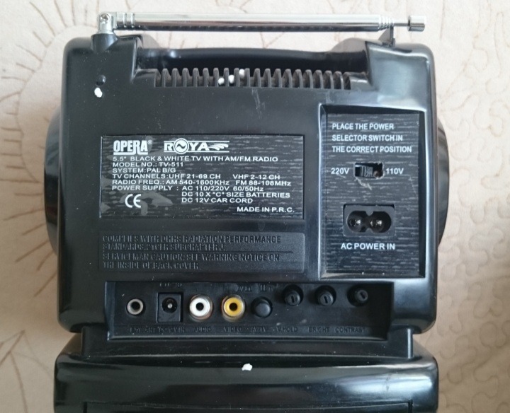 ساخت کره شمالیی ،، عیب تلویزیون خرابی ورتیکال آن است ،،، بدون خط و خش و شکستگی هستش ،،، دارای گیرنده تلویزیونی UHF و VHF و گیرنده رادیویی FM-AM ،،، دارای ورودی صوت و تصویر AV و جک خروجی هدفون هستش بهمراه کابل برق و کابل رابط AV ,,, دارای ورودی برق شهری و ورودی 12 ولتی ( آداپتور 12ولت یا برق ماشین) ،،، محفظه باتری خور دارد ،،،