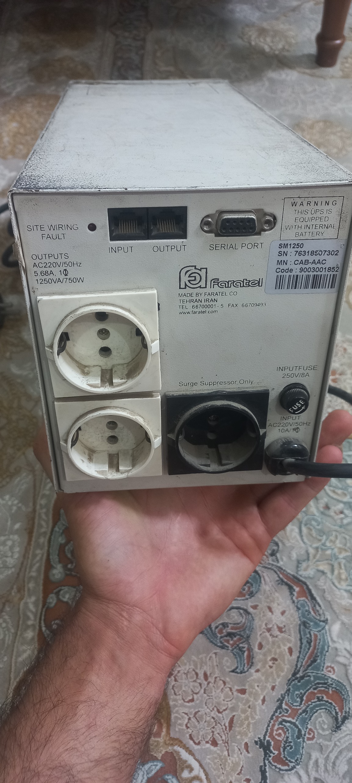 یک دستگاه یو پی اس فاراتل مدل sm1250 سالم و بدون مشکل ، فاقد باتری ، درب جلو دارای شکستگی میباشد ولی تاثیری بر روی ظاهر و عملکرد دستگاه ندارد