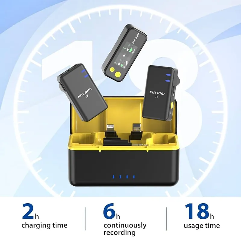 باتری 18 ساعته: با داشتن یک جعبه شارژ، این کیت میکروفون را میتوان تا 2 بار شارژ کرد و تا 18 ساعت زمان استفاده را فراهم کرد. ایدهآل برای مصاحبههای ویدیویی، پادکست، ولاگ و دیگر نیازی به نگرانی در مورد عمر باتری نیست.