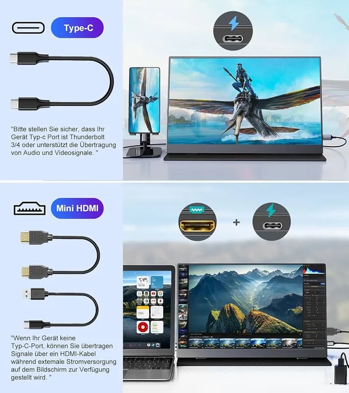 Plug & Play - نیازی به نصب درایور نیست. برای استفاده، کافیست یک کابل HDMI یا کابل USB-C را وصل کنید (توجه داشته باشید که کابل USB-C باید یک کابل کاملاً کاربردی باشد).